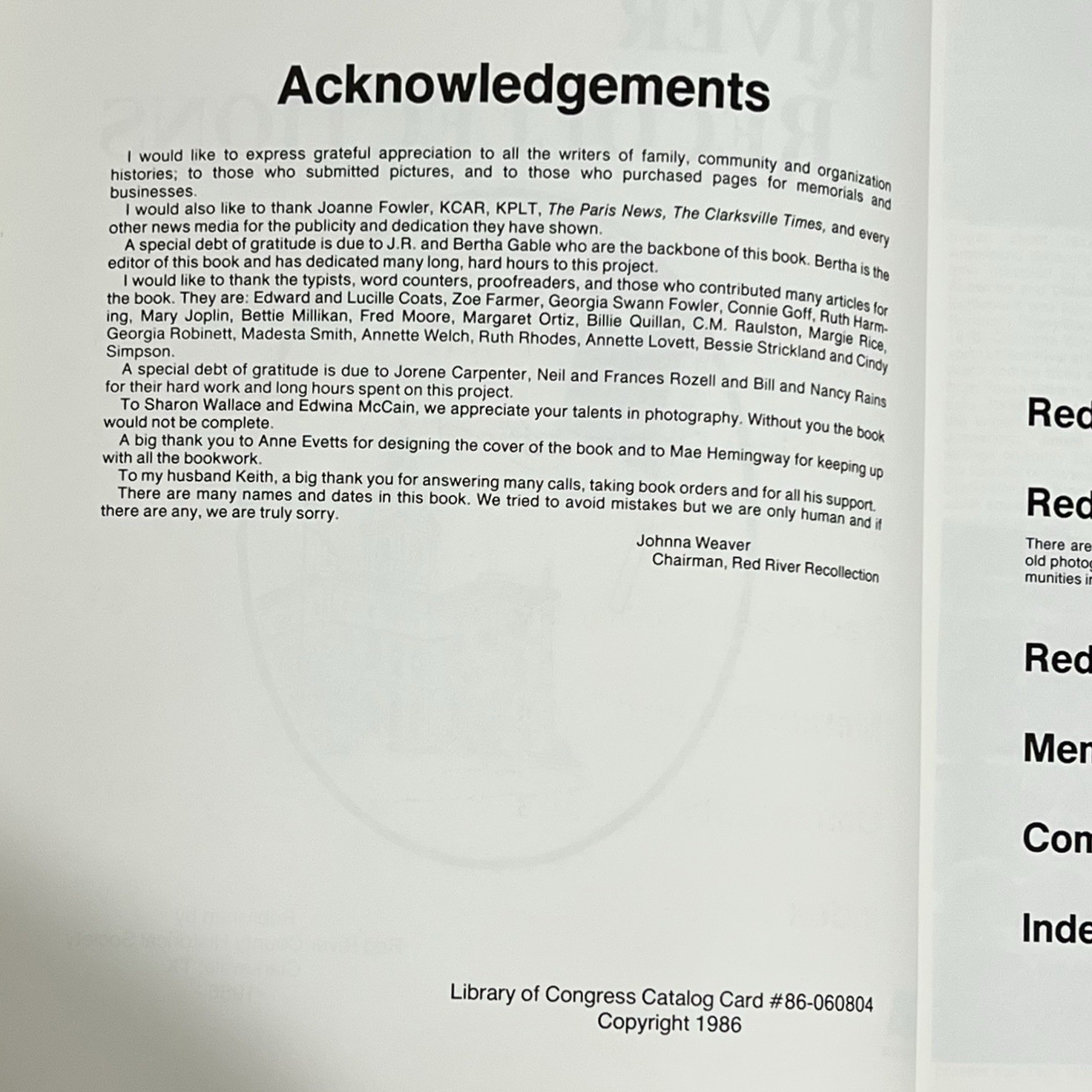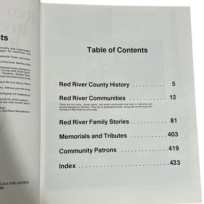 Red River Recollections, published in 1986 by the Red River County Historical Society (Clarksville, Texas). Hardcover, 437 pages. This local history and genealogy book includes extensive information about Red River County, Texas, its communities, families, and organizations. Sections include: ? Red River County History ? Red River Communities ? Family Stories ? Memorials and Tributes ? Community Patrons ? Full Index Copied page of local family tree The front pages include blank Family Tree and Family Record sections ? these pages are unused. Details: ? Title: Red River Recollections ? Publisher: Red River County Historical Society, Clarksville, TX ? Copyright Year: 1986 ? Hardcover with embossed gold medallion cover ? Condition: Very good ? clean pages, tight binding, minor cover wear from age, no writing in family record pages A valuable resource for anyone researching Red River County genealogy or Texas local history.