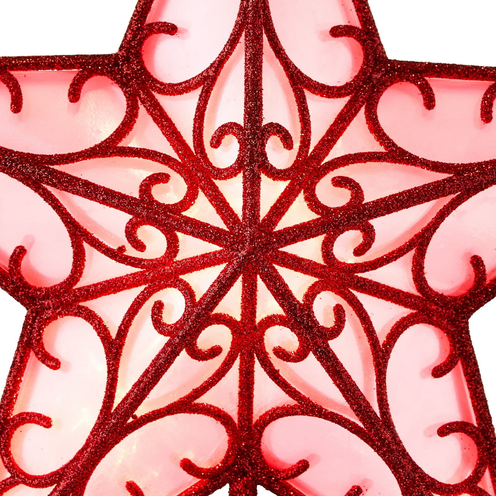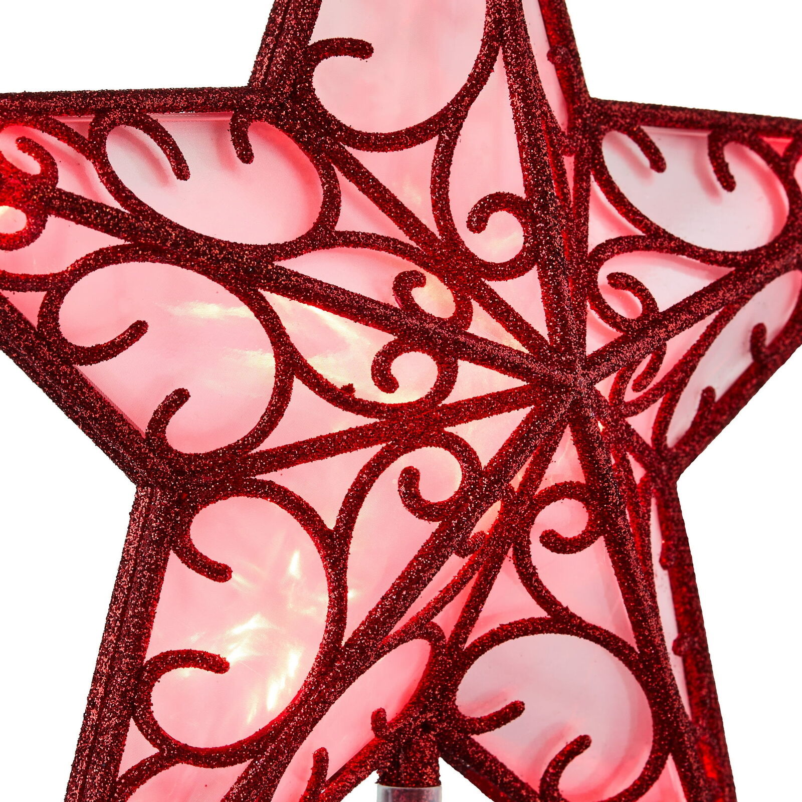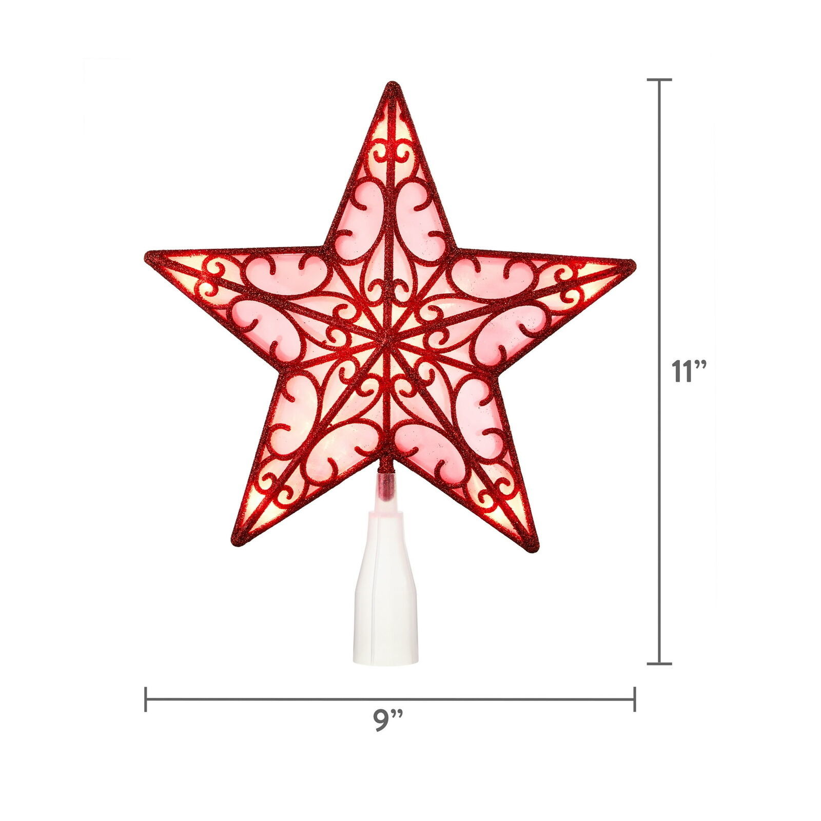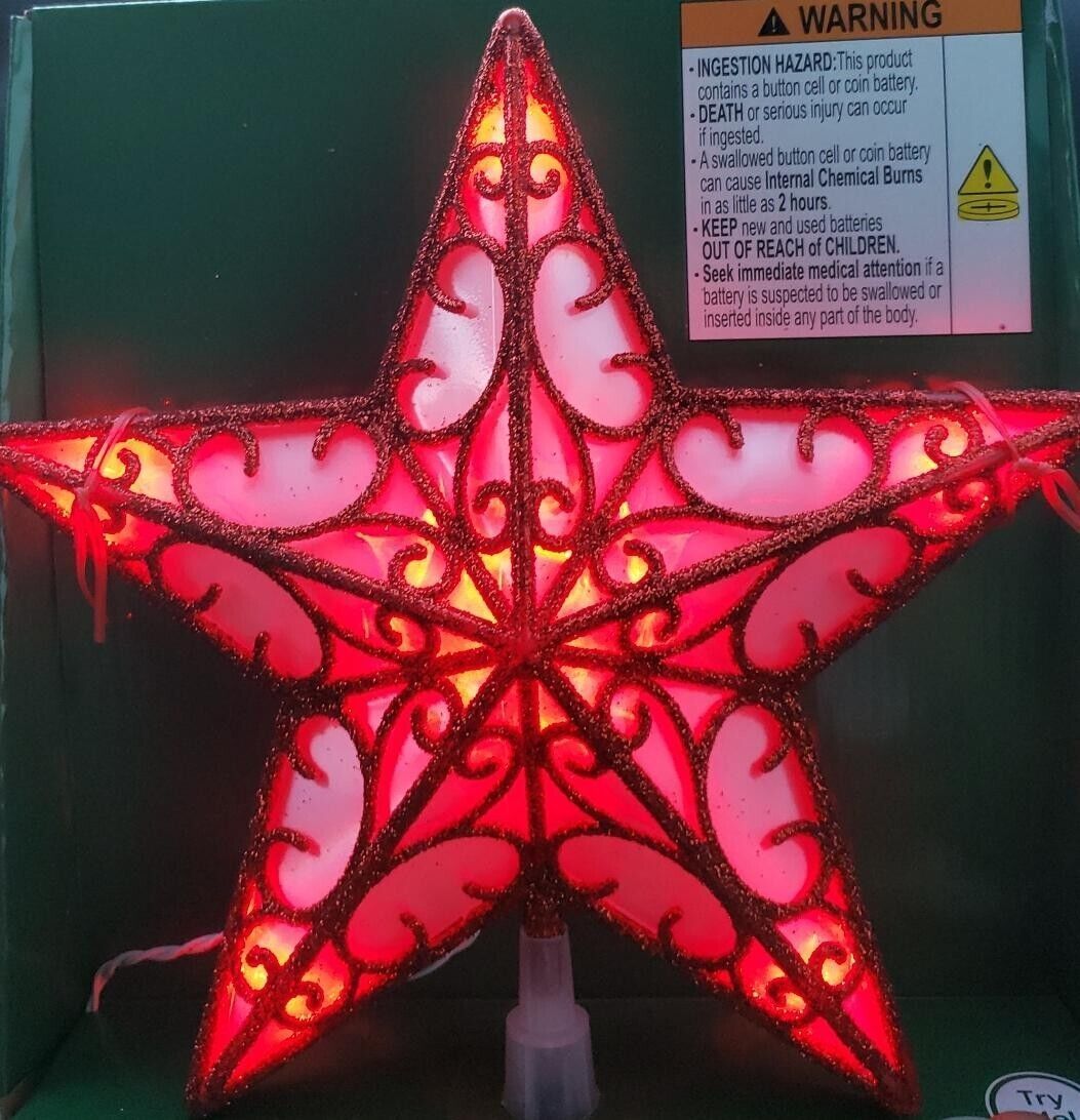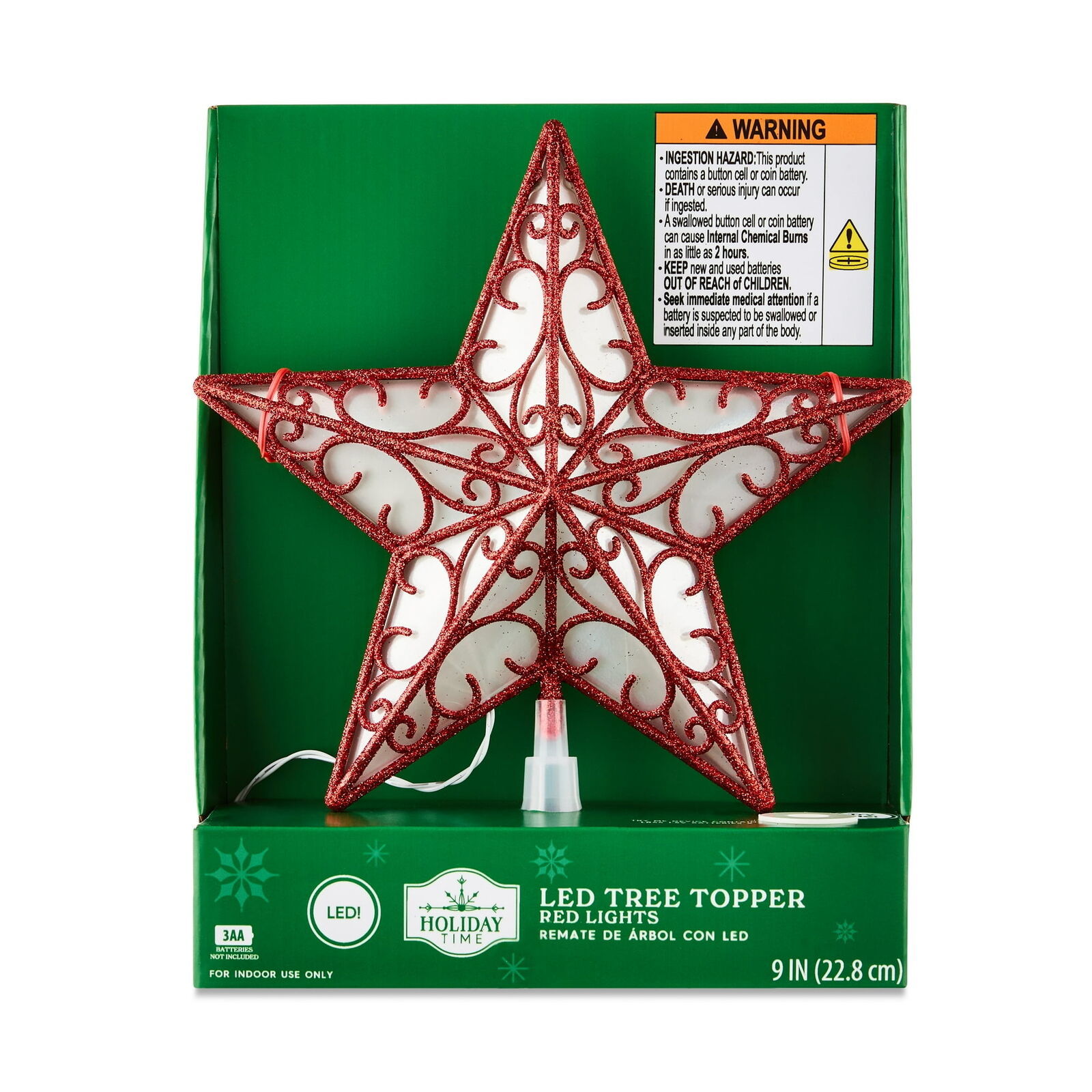 Red Star Battery-Operated LED Christmas Tree Topper, 9", by Holiday Time Holiday Time Red Star Battery-Operated LED Christmas Tree Topper, 9" Features 10 steady-burning red LED bulbs Includes 3 functions: ON, OFF, and TIMER- 6 hours on / 18 hours off Festive addition to both artificial and live Christmas trees Uses 3 AA batteries; not included Ideal for indoor use Seasonal and festive Pair with other Holiday Time decorations and accessories Please read all cautions carefully to reduce the risk of fire and electrical shock