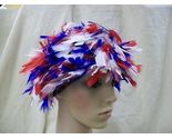 Great Patriotic Wig. Unisex: for male or female. One size fits most. Feather Colors are a mixture of Red, White, Blue. Feathers are attached to a black fabric cap. Feathers may need to be fluffed or adjusted to conceal cap. I have added a photo with feathers parted to show cap. Could be used with many costumes or Patriotic Political Events.