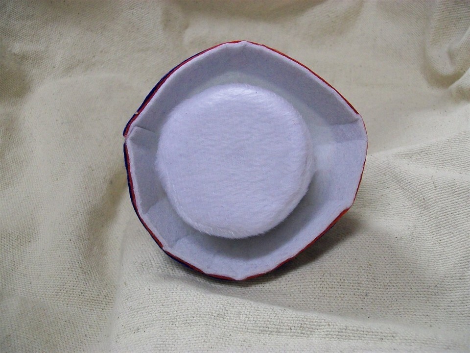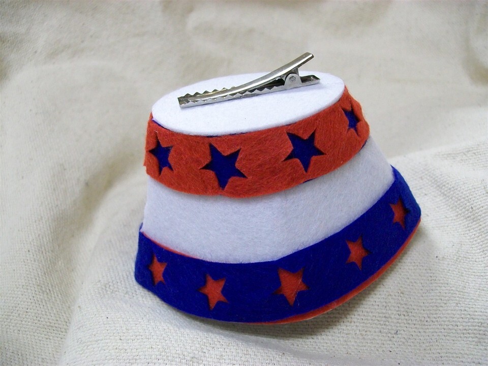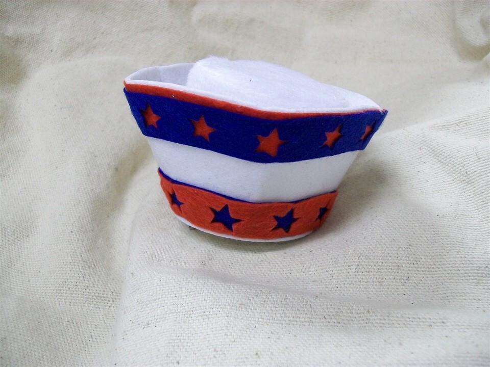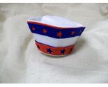 Patriotic Themed Mini Sailor GOB Costume Hat Hair Clip. Mini White felt-like Hat With Red Blue layered Cut out Stars. Can be worn by Adults Children. Could also be worn by pets with longer hair. Cute Accessory for Patriotic 4th of July Parade, Crafts, or dolls. This is a small hat approx. 2" tall. Approx. 4" round. Package states Not Recommended for Ages under 3.