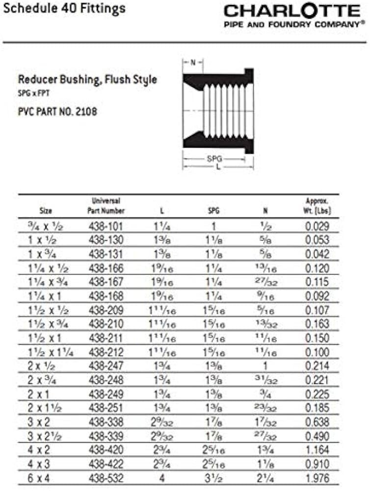 The Charlotte Pipe 02108-6200 reducing bushing is a Schedule 40 PVC pressure fitting designed to connect a 4-inch spigot-end pipe to a 3-inch female pipe thread (FPT) component in cold water, irrigation, or pool plumbing systems. Molded from rigid, lead-free PVC, it delivers high tensile and impact strength for reliable performance in pressurized applications up to 140F. The smooth interior minimizes flow resistance, while the solid-wall construction provides superior sound dampening compared to foam-core alternatives. Suitable for potable water use, this white fitting meets NSF/ANSI 14 and 61 standards and is certified by IAPMO for safety and compliance. Installation requires standard PVC primer and solvent cement?no special tools needed?making it ideal for residential and light commercial pressure piping where temperature and chemical resistance are critical.
