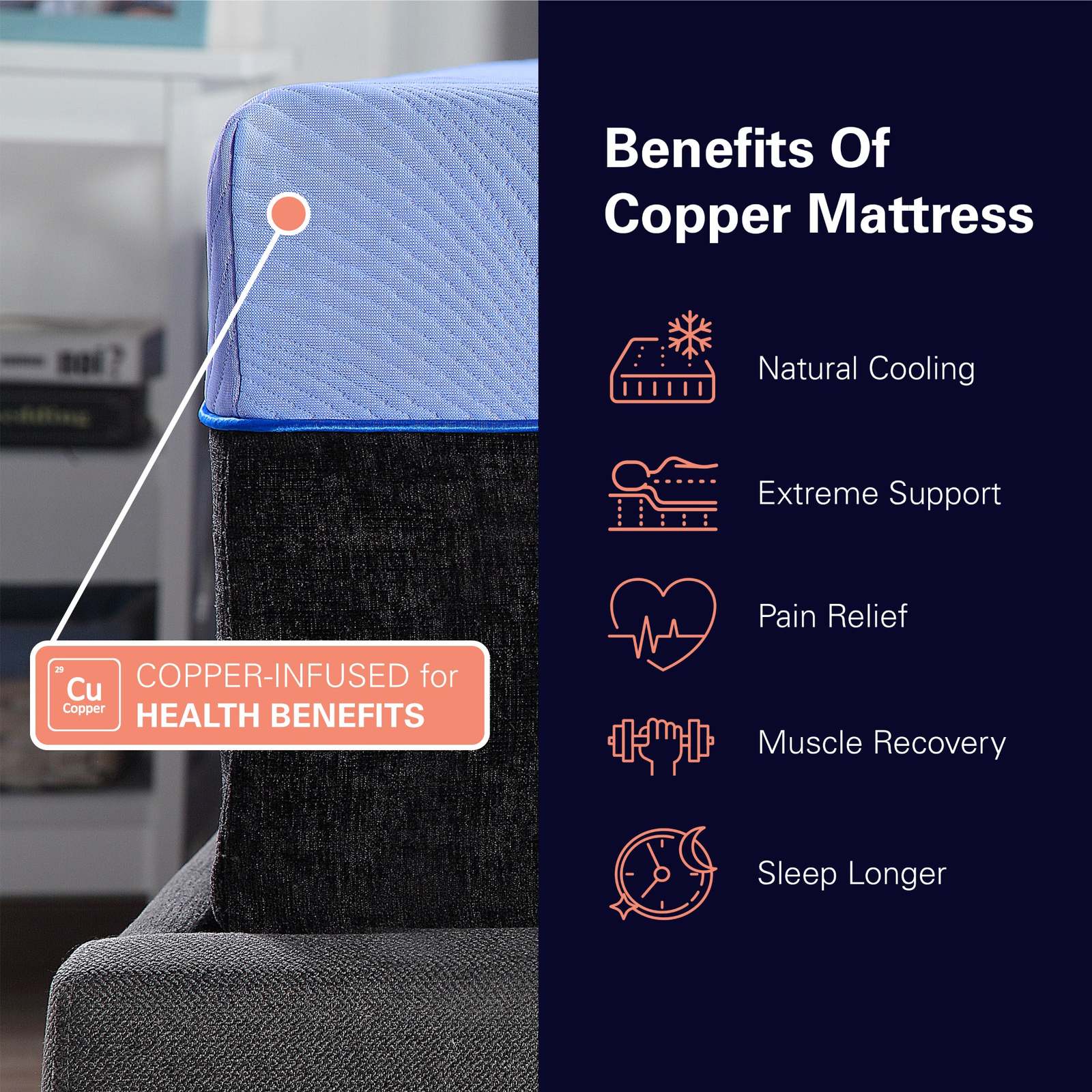 Plush Layer - 1.5 inch Cooling Copper Infused Memory Air Foam relieves pressure. Comfort Layer - 1.5 inch Premium Hypoallergenic Talalay Latex Foam helps relax muscles and relieve tension. Transition layer - 1.5 inch high-density support foam for longevity and foundation to upper layers. Support Layer - 6 inch Individually Wrapped Foam Encased Coils for spinal alignment with support to heavier parts of the body. Foundation Layer - 1.5 inch Structural Foam prevents sag to extend mattress life.