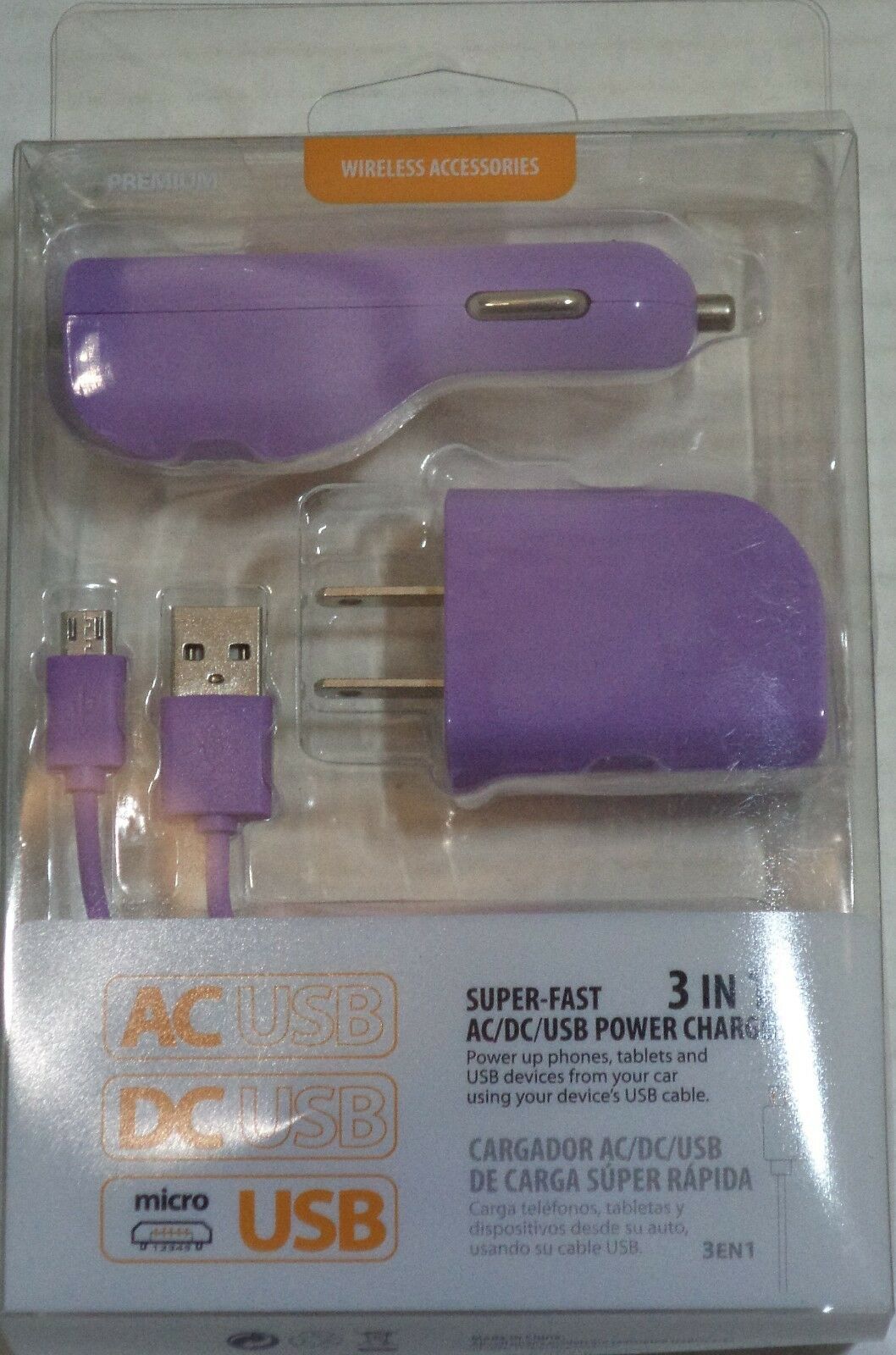 You are Buying One Brand New Reiko 3-In-1 Charger Android / Data Cable Micro USB For Galaxy S3, S4, S5, S6, S7 Note 5, 4, 3, LG G4, G5, And Nexus Phones Color Purple Product Description Color:Purple | Product Packaging:Standard Packaging Our 3-in-1 charging device Android can power up your Motorola v9 and all your standard USB cable devices at the convenience of your own home, car, or while you?re travelling. You can simply plug in any device with a existing USB port and begin powering up. Our detachable Charging Cables are specially designed to power your mobile devices and also functions as a Data transfer cable simultaneously. This product consists of 3 parts : 1) home adaptor, 2) car adaptor, USB data/charging cable. It is available in various colorful choices. This product is manufactured in ready to sell packaging. US carrier: at t, sprint, T-Mobile, Verizon 3in1 AC/DC/USB power charger; Fast power charges without a computer; Fast, power charges while you drive 1amps AC; Input: AC 100-240V, 50~60Hz max; Output: DC 5V 1A 1amps DC; Input: DC 12v-24V; Output: DC 5V 1000MA Small and light enough for travel and perfect for long trips or daily commuting Charging automatically stops when your device is fully charged