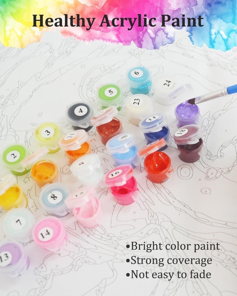 Indulge your creative spirit with our Relaxing Acrylic Paint by Numbers Set! Not only does it provide a soothing artistic outlet, but it also results in a stunning piece of art that you can proudly display in your home. Whether you're an aspiring artist or simply looking for a tranquil pastime, this paint by numbers set is designed to provide countless hours of enjoyment.