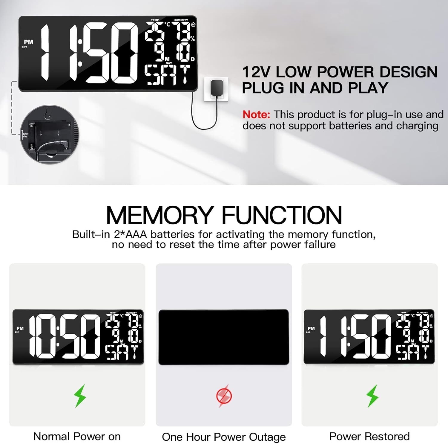 -You only need to use our complimentary power adapter and power cord to make the clock wall digital large work (Does not support charging or batteries). 2*AAA batteries (included) are used to activate its memory function, which automatically saves the time and alarm settings even if the power is unexpectedly interrupted.
