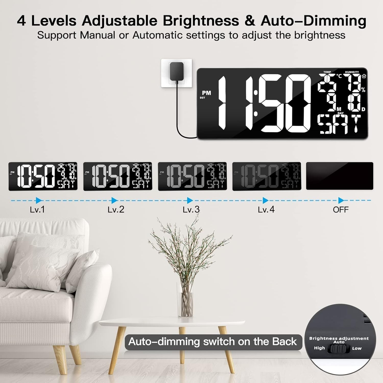 Digital clock large display built-in sensitive light sensor automatically adjusts to a brightness more suitable for viewing based on external light. Also has 4 levels of adjustable brightness display (including full black) for manual adjustment. When the Auto DST function is on, the time is automatically set one hour forward or backward, eliminating the need for frequent settings.