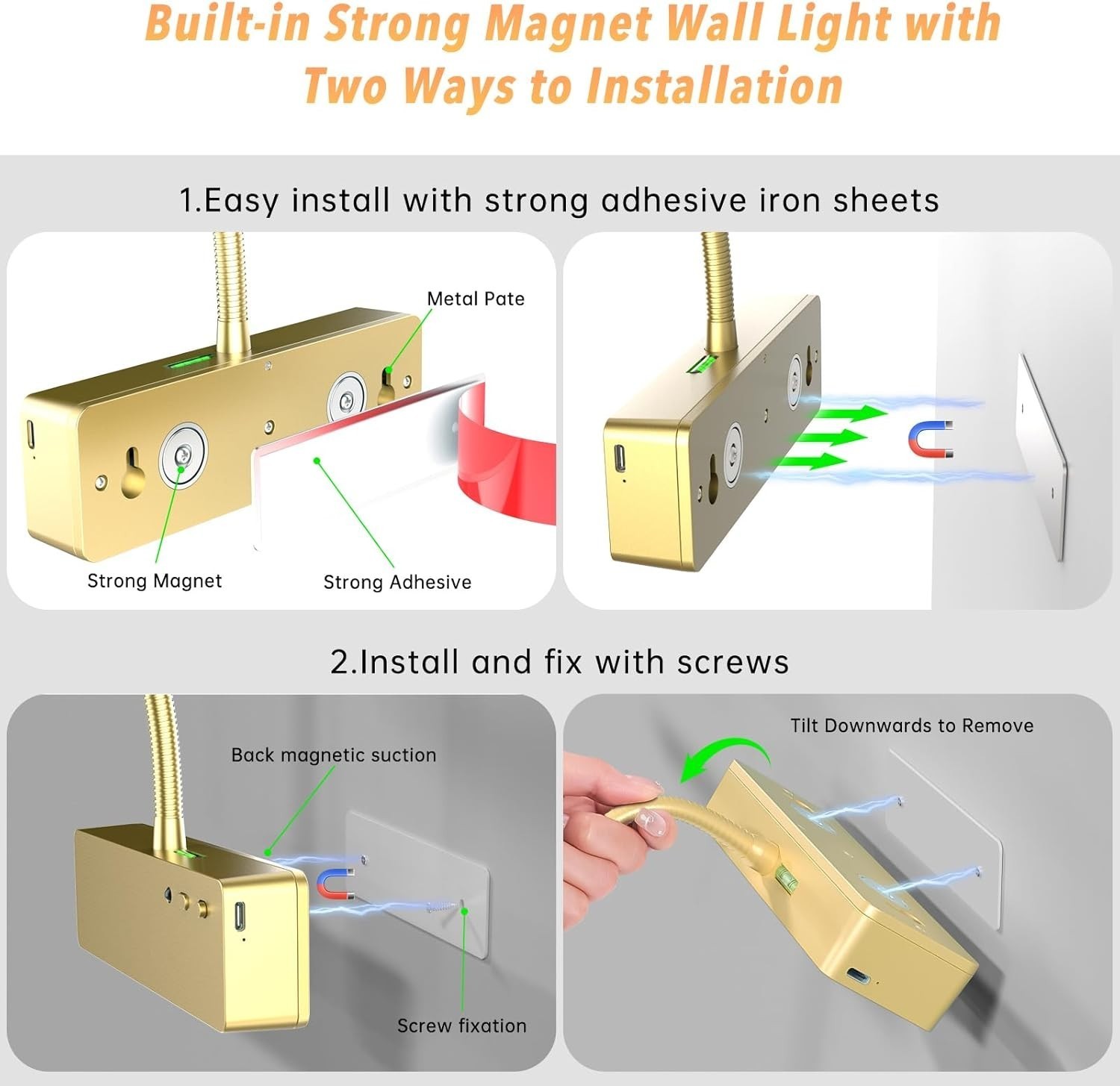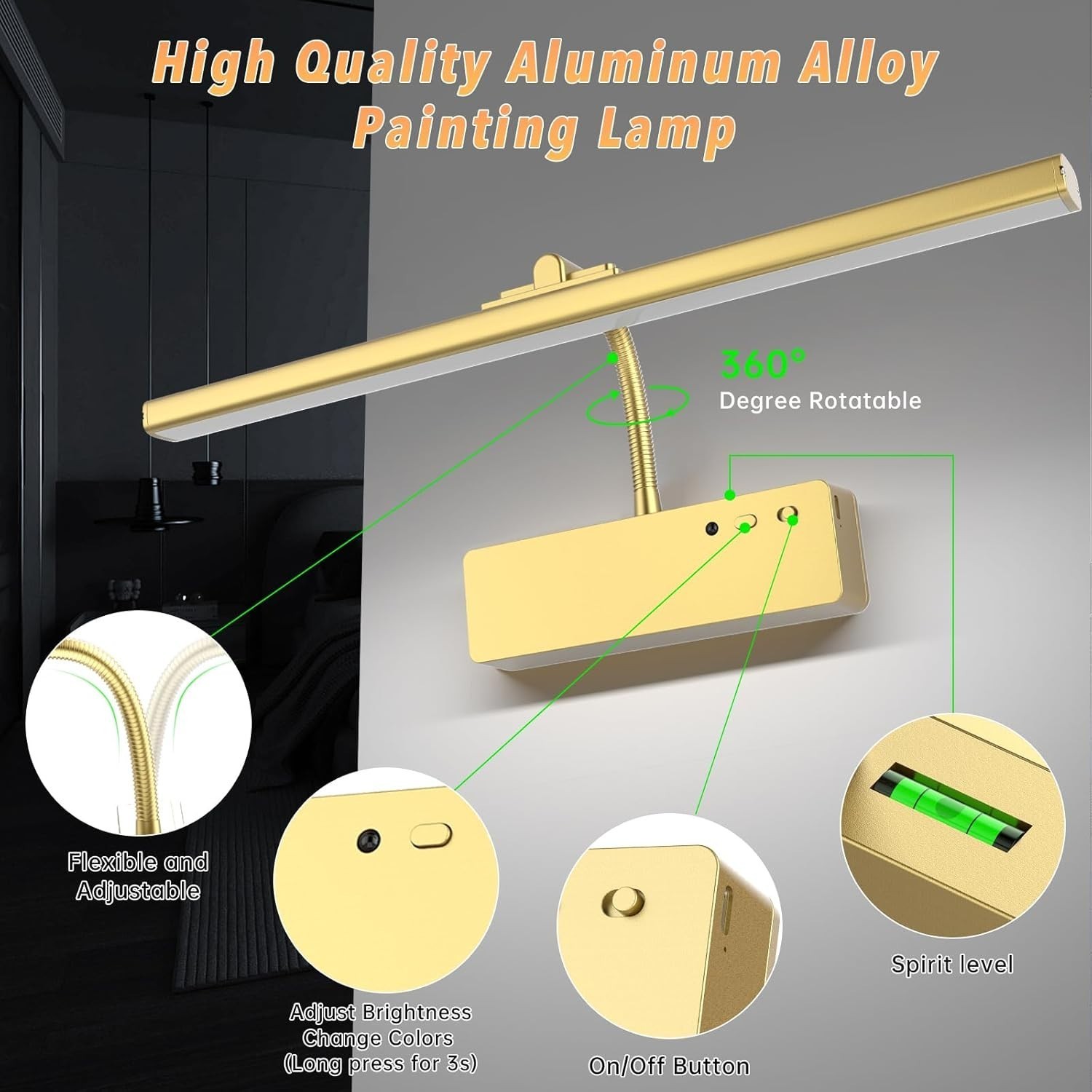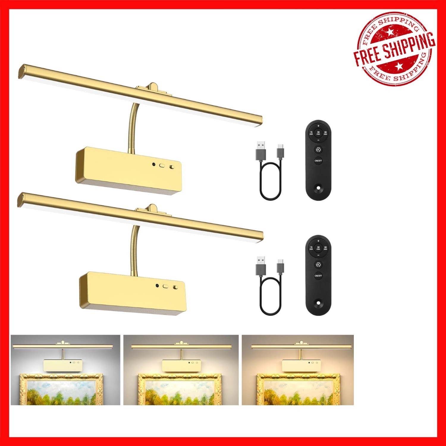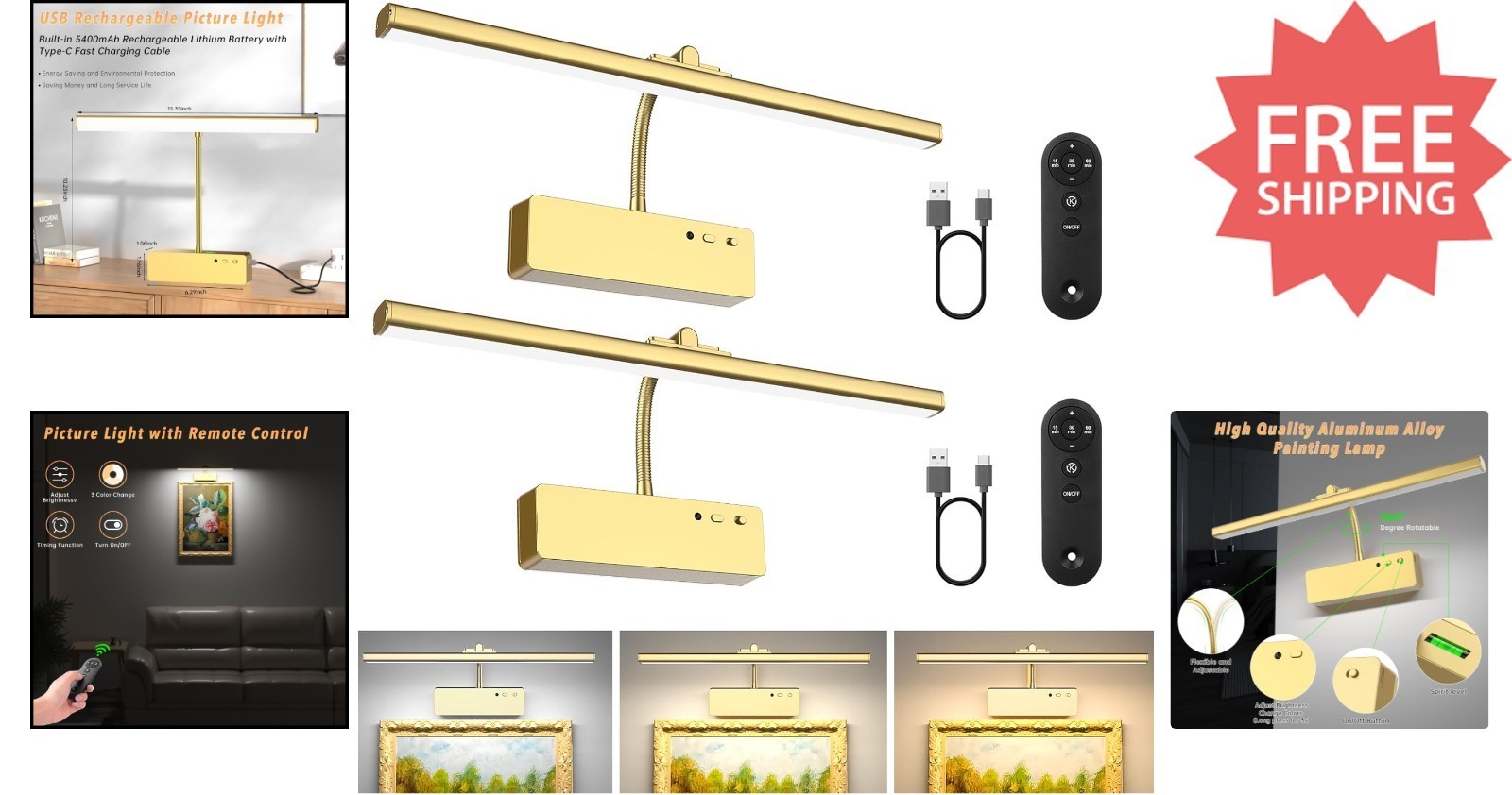 Enhance your artwork and photos with our Wireless Rechargeable Picture Light. Featuring a sleek design with flexible 360 rotation and adjustable head, it offers customizable illumination to highlight your prized pieces. Equipped with a powerful 5400 mAh rechargeable battery, this elegant light provides three color temperature options?3000K, 4500K, and 6500K?and adjustable brightness for the perfect ambiance. Control it remotely or manually, with a convenient timer function to prolong battery life. Installation is effortless with a built-in magnet or included metal plates and screws?no tools required. Available in sophisticated gold or modern black finishes, it?s ideal for wall art, portraits, galleries, and more. Make your space shine with style and ease.