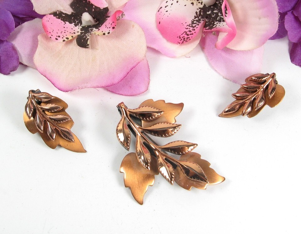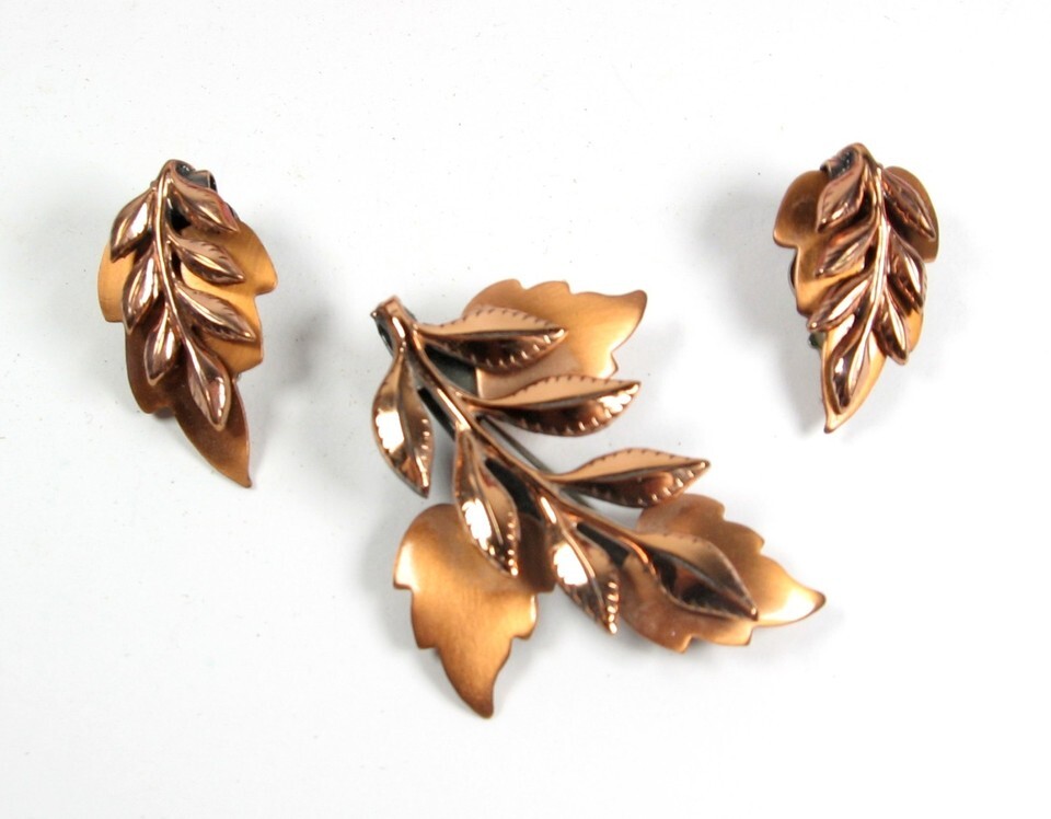 RENOIR Vintage Copper LEAF BROOCH & Clip On EARRING SET Pin Designer Signed WOW