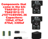 Repair Kit 5303935119 316027418 Frigidaire Oven Control Board Repair Kit Relays that come in the kit: J1071CS9VDC.36, T9AS1D12-15?, T9AS1D12-15?, Capacitors: 100uf, 470uf, 470uf 3300uf Comes with 3 relays 4 capacitors components that repair 99% of all control boards. You must know how to solder with a soldering iron and you must know the correct orientation to install the parts. Capacitors and resistors only go one direction so don't install them backwards b/c they will not work. 50161616