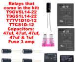 Components that come in the kit: T9GV5L14-22, T9GS1L14-22, T77V1D10-12, T7CS1D-12, 3 amp fuse and Capacitors: 47uf, 47uf, 47uf, 47uf and 1uf