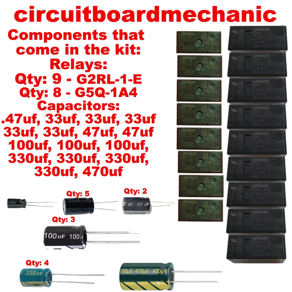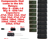 Relays that come in the kit: QTY 9 G2RL-1-E, QTY 8 G5Q-1A4, Capacitors: .47uf, 33uf, 33uf, 33uf, 33uf, 33uf, 47uf, 47uf, 100uf, 100uf, 100uf, 330uf, 330uf, 330uf, 330uf, 470uf