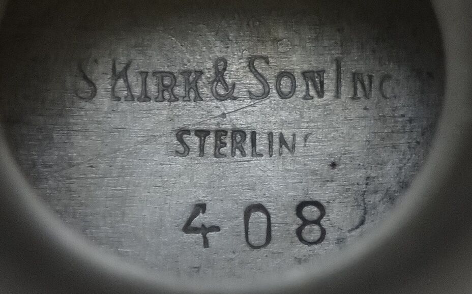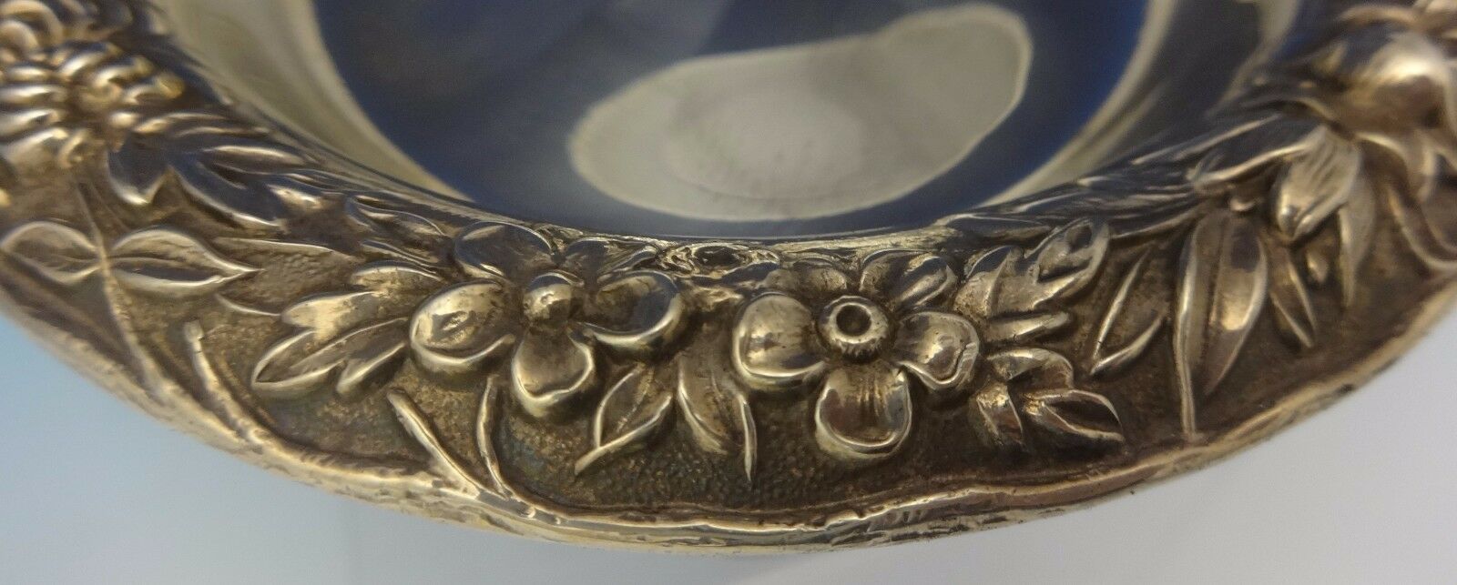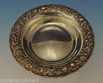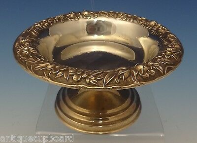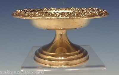 Repousse by Kirk sterling silver raised compote. It's marked with #408 and the piece dates from 1925-32. It measures 2" tall, 5" in diameter, and it weighs 6.1 ozt. It is not monogrammed and is in excellent condition.