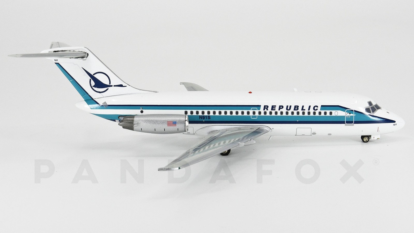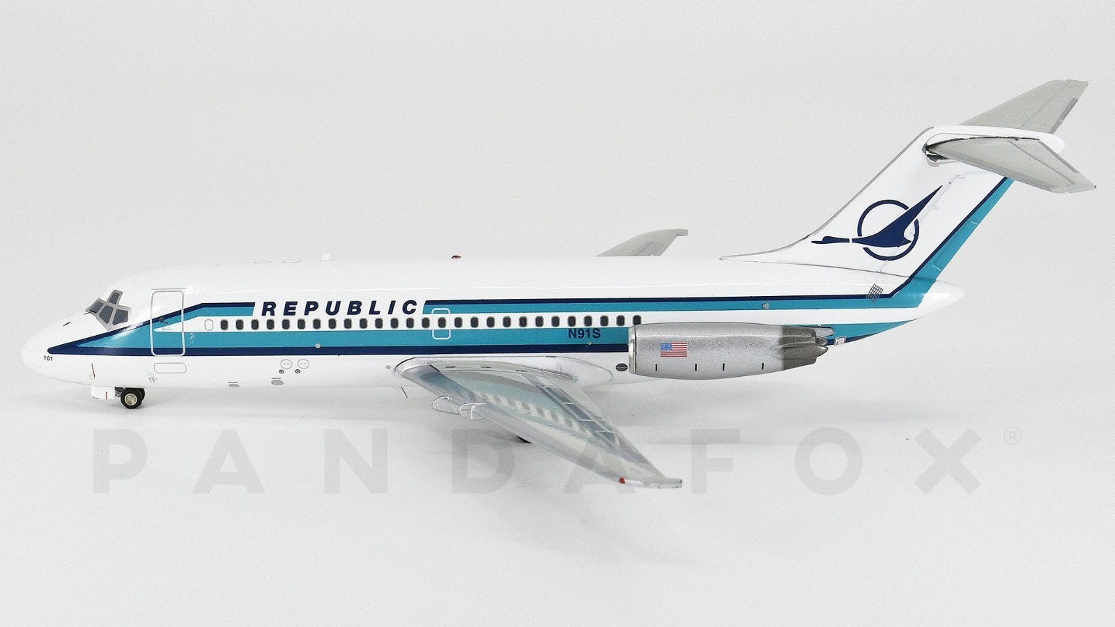 PRODUCT DESCRIPTION High quality collectible die-cast model. Metal construction. Pre-assembled and ready to display. Realistic print of airline livery. Accurate details on the surface such as antennas, registration, panel lines and windows. PRODUCT SPECIFICATIONS Livery Republic Airlines Aircraft DC-9-15 Registration N91S Manufacturer GeminiJets Scale 1:200 Material Metal Length x Wingspan 6.26" x 5.36" Landing gears Fixed with fuselage Display stand Included