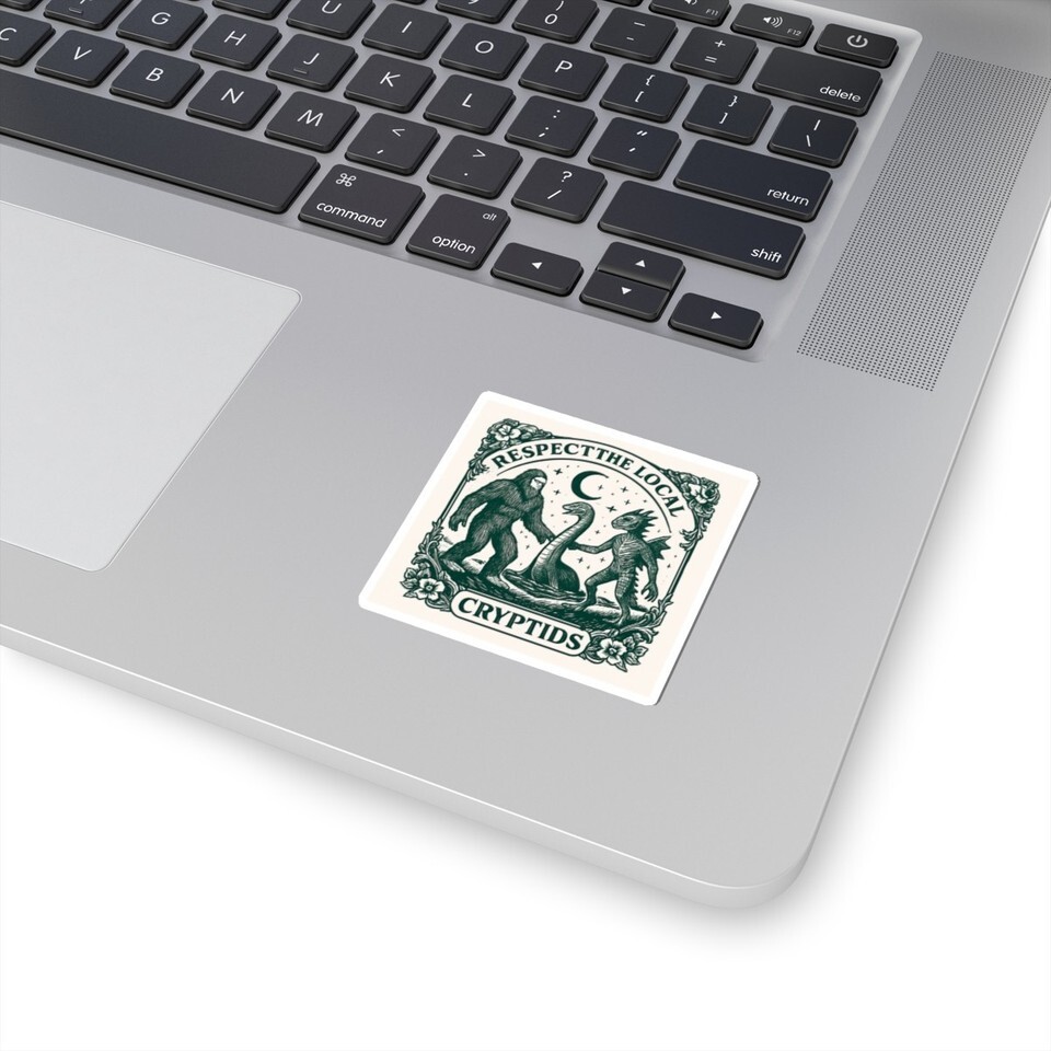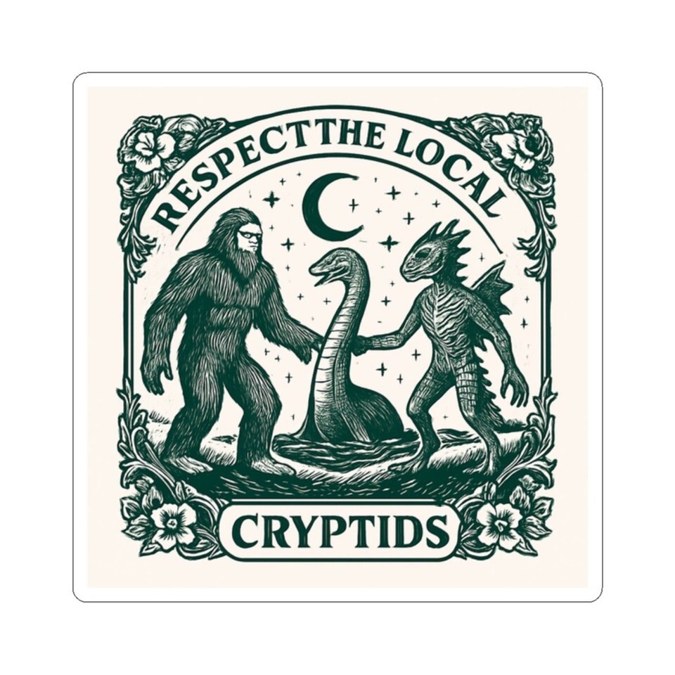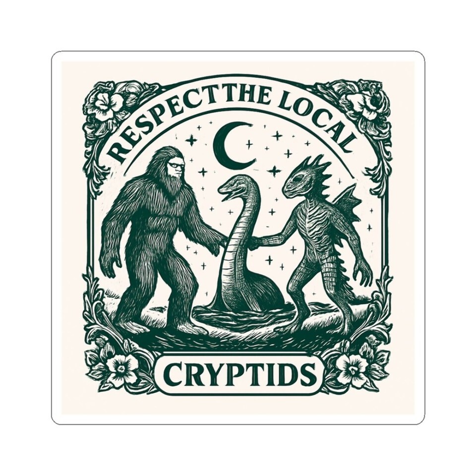 Respect the Local Cryptids Sticker | Funny Waterproof Cryptid Vinyl Decal | Bigfoot Mothman Loch Ness Monster Sticker for Water Bottles, Laptops, Journals More Show your cryptid pride with this bold and funny ?Respect the Local Cryptids? sticker ? a must-have for believers, paranormal lovers, and anyone who knows the woods are never empty. Featuring clean, eye-catching lettering and a mysterious vibe, this vinyl sticker is perfect for laptops, water bottles, notebooks, and more. Whether you?re team Bigfoot, Mothman, or Nessie, this sticker is a playful reminder to treat the unexplained with kindness and a healthy dose of curiosity. Matte or glossy finish Handmade with cryptid-level care ? Great gift for: Cryptid hunters believers Paranormal podcast fans National park explorers Sticker collectors Lovers of Bigfoot, Mothman, Chupacabra more! Add this to your collection and help spread the message: Be kind. Be curious. Respect the local cryptids. ? Product features - Glossy paper finish for a scratch-resistant surface - Long-lasting vinyl with strong adhesive for smooth surfaces - Vibrant colors printed with eco-friendly inks - Available in white and transparent options - Quick, smooth, bubble-free application for easy use Care instructions - Use a soft, clean and dry cloth to gently brush any dust or dirt off from the center of the sticker outwards.
