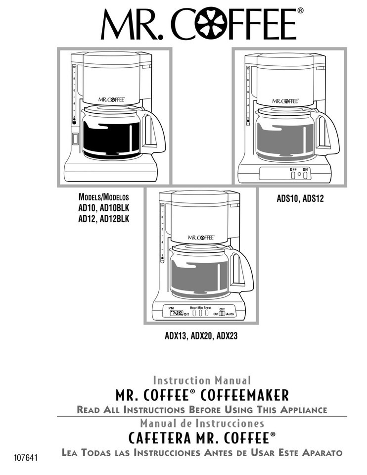 (ONE) Printed Manual Mr. Coffee Maker for: ADX20, ADX13, ADX23, AD10, AD12, AD10BLK, AD128LK, ADS10, ADS12.