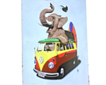 Retro look metal sign features colorful VW bus with happy elephant poking out the sunroof! Elephants baseball cap blew off. License plate 3L3FUN