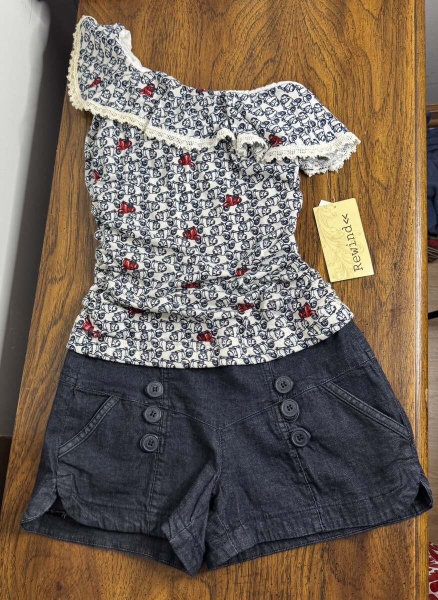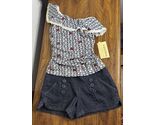 Primary image for Rewind Size XS One Shoulder Romper Lace Trim Ruched Waist Denim Shorts