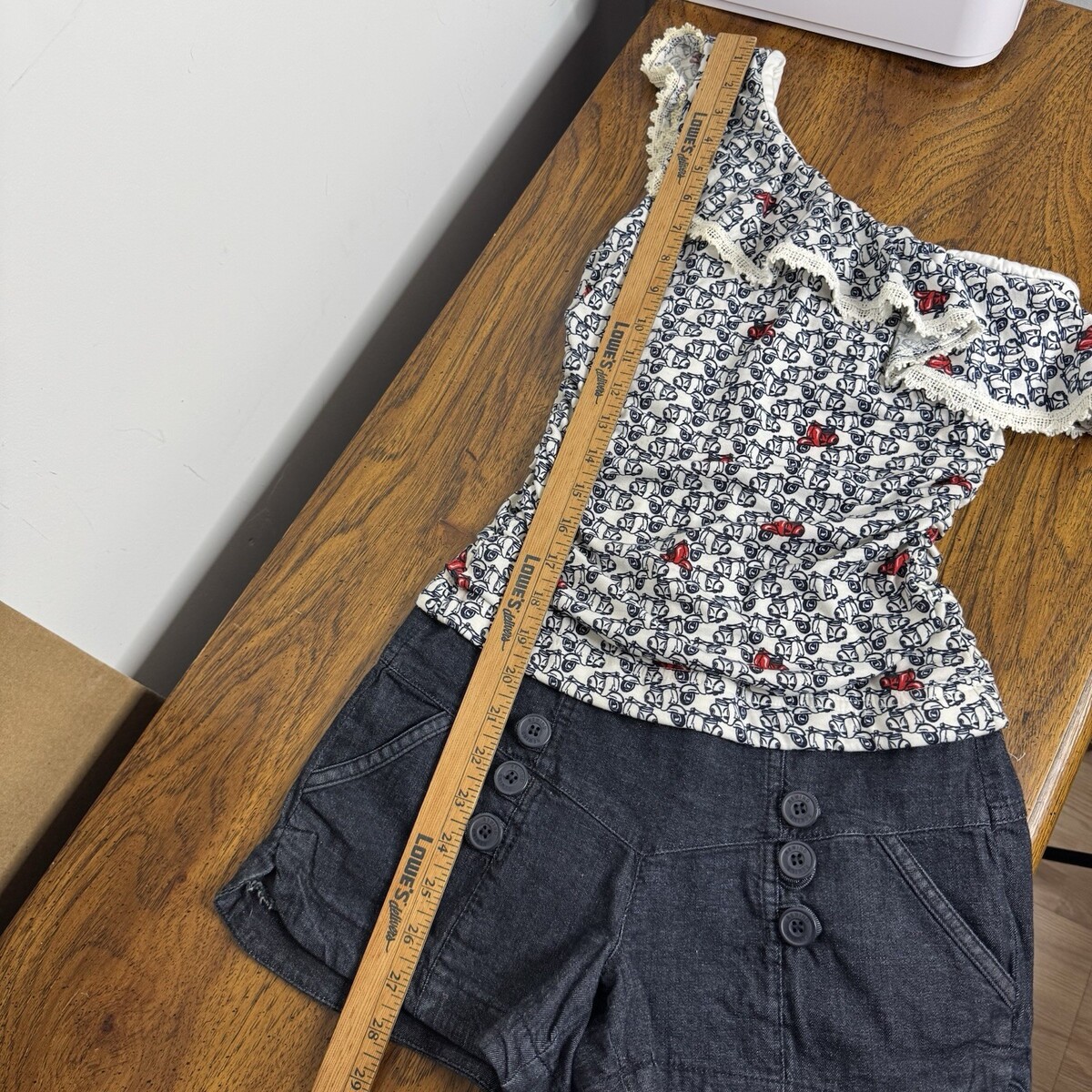 Rewind Size XS One Shoulder Romper Lace Trim Ruched Waist Denim Shorts