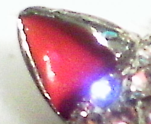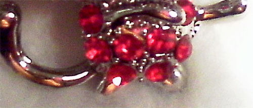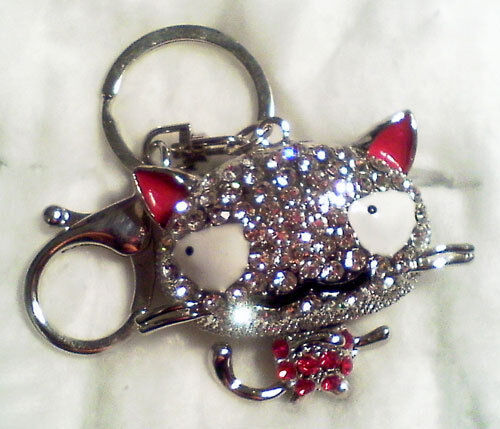 Rhinestone cover the head of this sweet cartoon cat. A red stone make up the rest of his tiny body with a silver tail attached.