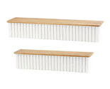 Add a touch of modern elegance to your walls with the Ribbed Wood Wall Shelf Set. Featuring cool white tones and a natural wood grain shelf top, these shelves offer a sleek rectangular shape with a floating design that complements any room. Each piece comes with two nail holes on the back for securing them safely to the walls of your home. Sold as a set of two assorted sizes, these versatile shelves are perfect for displaying decorative accents, vases, or picture frames, bringing functionality and style to your home year-round.