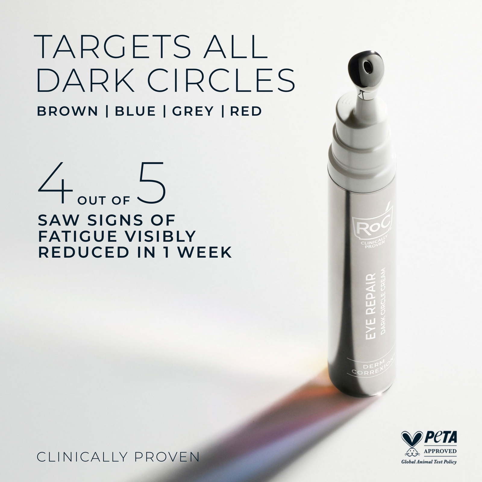 Derm Correxion Eye Repair Dark Circle Cream is a non-invasive eye treatment that helps reverse the look of persistent dark circles for dramatically brighter, rested, younger-looking eyes. Defy the look of eye fatigue with a patented breakthrough from RoC. NEW Derm Correxion Eye Repair Dark Circle Cream, developed with Dermatologists Cosmetic Surgeons, is a non-invasive eye treatment that helps reverse the look of persistent dark circles for dramatically brighter, rested, younger-looking eyes. Inspired by advanced lasers, this formula combines 4 ingredients clinically proven to reduce the 4 shades of under-eye discoloration instantly over time. Cooling precision tip massages away signs of fatigue.