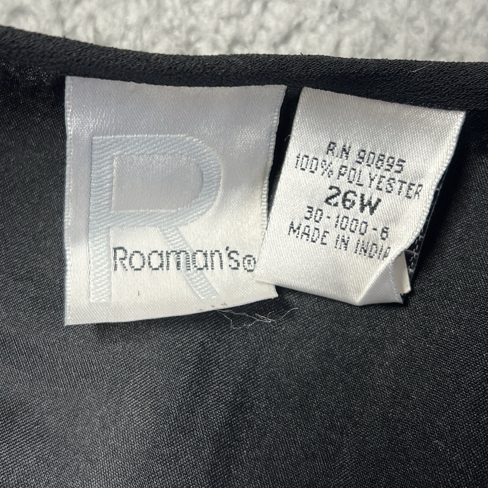 The Roaman's Blouse is a black goth boho witchy whimsy embroidered flare tunic top in size 26W. This off-shoulder pullover blouse features embroidered accents, a flared sleeve, and a regular fit. Made of polyester, this blouse is suitable for travel, casual occasions, and all seasons. Hand wash only to care for this stylish and unique piece from Roaman's, perfect for women who embrace a bohemian theme in their fashion choices.