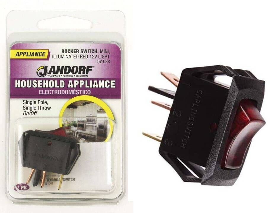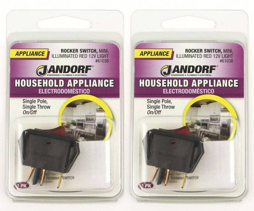 Jandorf 61038 SPST Rocker Switch 10A 30V Red Illuminated Tab Terminal 2-Pack The Jandorf 61038 mini rocker switch is a compact, UL-listed appliance switch designed for reliable on/off control in low-voltage circuits. Featuring a single-pole, single-throw (SPST) configuration, it handles up to 10 amps at 30 volts DC and includes a built-in red 12V incandescent pilot light that illuminates when the circuit is active. The switch actuates with a smooth rocking motion and uses quick-connect tab terminals for fast, tool-free wiring?ideal for control panels, power tools, marine electronics, and household appliances. Its black housing with a bright red illuminated actuator provides clear visual status indication, while the robust design ensures long service life in both residential and light industrial settings. Features - SPST (Single Pole, Single Throw) rocker switch for simple on/off circuit control - Red illuminated actuator indicates when the circuit is energized (12V incandescent lamp) - Rated for 10A at 30V DC?suitable for low-voltage DC and light AC applications - Quick-connect tab terminals enable rapid, solder-free installation - Compact footprint fits standard appliance and panel cutouts - UL Listed for safety and compliance in North American applications - Black housing with red rocker for high-contrast visual feedback - Smooth-action lever for easy operation with gloves or bare hands - 2-pack provides spare or dual-circuit support for repairs or builds - Commonly used in power supplies, battery systems, marine controls, and DIY electronics Specifications - Brand Name: Jandorf - Model Name: Jandorf 61038 - Part Number: 61038 - Product Type: Illuminated Rocker Switch - Switch Type: Rocker - Circuit Configuration: SPST (Single Pole, Single Throw) - Electrical Rating: 10 A @ 30 V DC - Pilot Light: Red, 12V Incandescent (internal) - Terminal Type: 0.250 in Tab (Quick Connect) - Actuator Color: Red - Housing Color: Black - Wall Plate Included: No - UL/CSA Listed: UL Listed - Packaging Type: Carded - Quantity per Package: 2 - Item Weight: 0.06 lb - Country of Origin: China - UPC: 076598610384 - Global Trade Identification Number: 00076598610384 - Manufacturer: Jandorf Product Application This illuminated rocker switch is used by technicians, hobbyists, and OEMs in applications requiring clear power status and dependable switching?such as battery disconnects in RVs and boats, control panels for audio equipment, portable generators, workshop tools, and custom enclosures. The red indicator light confirms live circuit status at a glance, enhancing safety during maintenance or operation. Its tab terminals simplify retrofitting into existing wiring harnesses, while the UL listing ensures compliance for use in consumer-grade appliances and electronic devices. Ideal for 12V automotive, marine, or solar projects where visual feedback and compact size are essential.