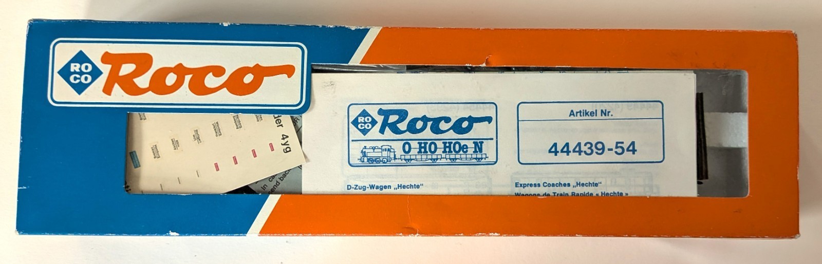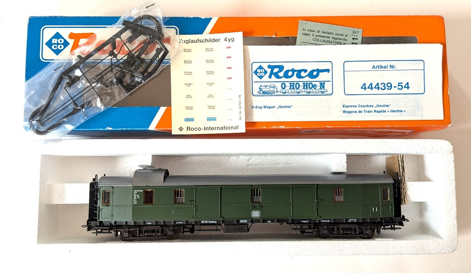 Roco H0 44449 German Railroad (DB) Baggage Car. New-old stock. Car is in excellent condition and comes with full paperwork incl. stickers and bag of extra parts. Box is slightly scuffed, but very good overall. Wheels are for DC operation but can be converted to run on AC tracks.