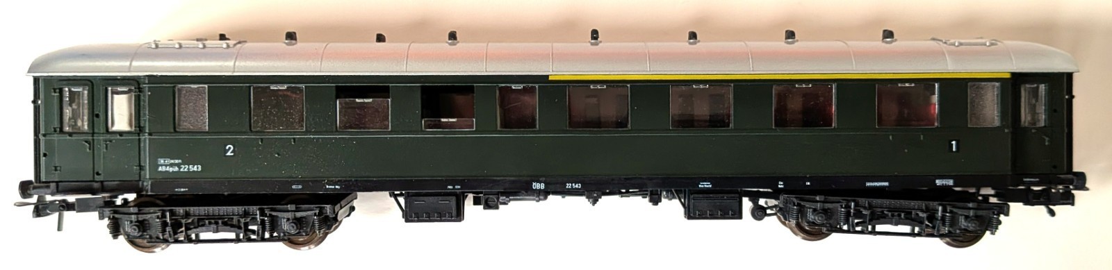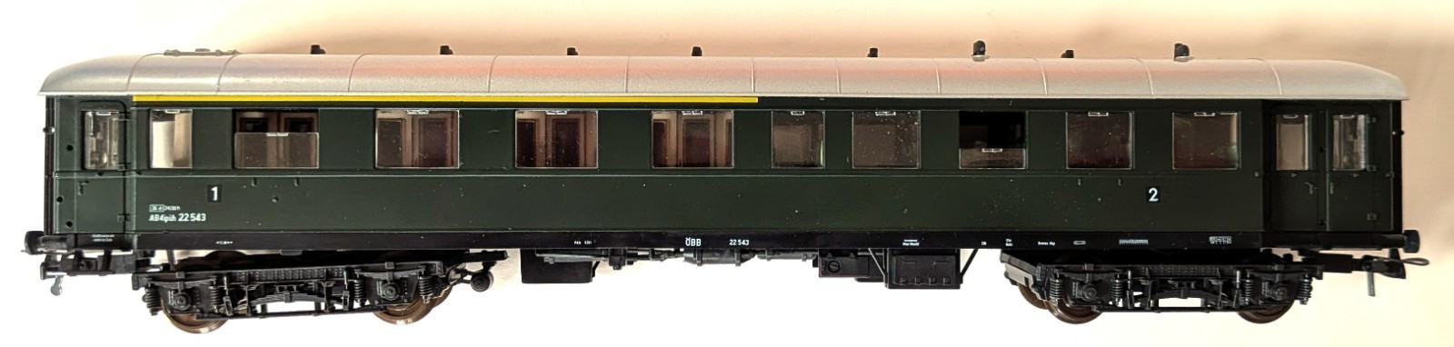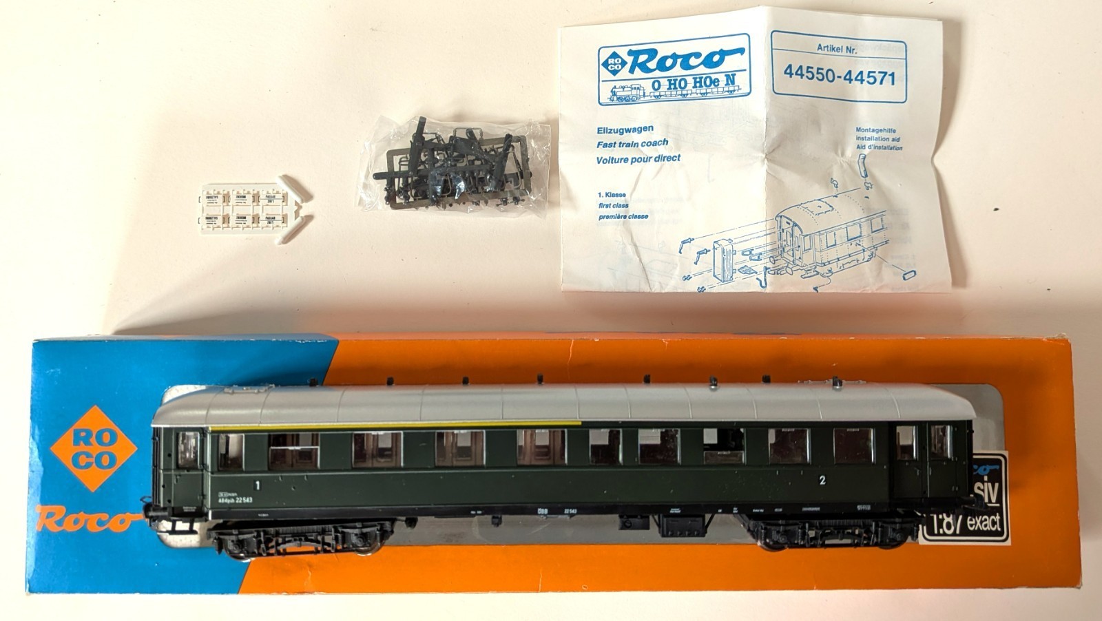 Roco H0 44569 Austrian Railroad Passenger Car, split into First and Second Class. New-old stock. Car is in excellent condition and comes with full paperwork incl. stickers and bag of extra parts. Box is slightly scuffed, but very good overall. Wheels are for DC operation but can be converted to run on AC tracks.