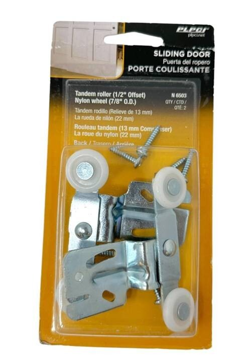Prime-Line N 6503 Roller Assembly 7/8'' Dia. x 1/4'' W Side Mounting Nylon 60-lb (4-PACK) THE (4) ARE BRAND NEW AND COMPLETE WITH THEIR HARDWARE! THE PACKAGES WERE OPENED AND INSPECTED. The Prime-Line N 6503 roller assembly is a heavy-duty, top-hung side-mount solution for bi-fold and wardrobe doors up to 60 lb per pair. Featuring 7/8" diameter convex-edge nylon wheels with ball bearings, it ensures smooth, quiet operation and extended service life?even under frequent use. The offset steel bracket is vertically adjustable for precise door alignment and height correction, accommodating door thicknesses from 3/4" to 1-3/8". Designed for compatibility with Acme, Stanley, and similar steel-framed bi-fold systems, each 4-pack includes four complete rollers (two pairs) and mounting hardware for two doors. Features - 7/8" diameter x 1/4" wide convex-edge nylon rollers reduce friction and noise on track - Ball bearing hubs enable effortless rolling and resist binding over time - Adjustable steel bracket allows 1/2" vertical fine-tuning for level door operation - Side-mount, top-hung design fits standard Acme/Stanley upper track configurations - Supports doors 3/4" to 1-3/8" thick with secure pan-head screw attachment - Nylon wheels resist chipping, wear, and temperature-induced deformation - Silver-finish steel bracket offers strength without added weight - Includes (4) rollers + (12) #8 x 3/4" Phillips pan-head sheet metal screws - Replaces worn OEM rollers without modifying existing track or stile - Tested for 60 lb capacity per pair?ideal for solid-core or mirrored wardrobe doors Specifications - Brand Name: Prime-Line - Model Name: Prime-Line N 6503 - Part Number: N 6503 - Product Type: Roller Assembly - Roller Diameter: 7/8 in - Roller Width: 1/4 in - Roller Material: Nylon - Roller Edge Type: Convex - Bearing Type: Ball - Bracket Material: Steel - Finish: Unfinished (Silver) - Mounting Type: Side Mount, Top Hung - Offset Size: 1/2 in - Adjustable: Yes (Vertical) - Weight Capacity: 60 lb (per 2-roller assembly) - Compatible Door Thickness: 3/4 ? 1-3/8 in - Suitable For: Acme, Stanley Wardrobe Doors - Number of Items: 4 (2 pairs) - Included Hardware: (12) #8 x 3/4" Phillips Pan-Head Screws - Product Dimensions: 2.00 x 0.75 x 1.00 in (per roller assembly) - Item Weight: 0.64 lb (4-pack) - Country of Origin: China - UPC: 049793765031 - Global Trade Identification Number: 00049793765031 - Manufacturer: Prime-Line Products Product Application This roller assembly is used by handymen, contractors, and property maintenance teams when repairing or upgrading steel-framed bi-fold closet doors in apartments, townhomes, and custom closets?particularly where smooth, silent operation and long-term reliability are needed. The adjustable bracket corrects sagging or misalignment caused by settling frames or worn hardware, while the ball-bearing nylon wheels glide consistently on aged or slightly corroded tracks. Commonly installed in high-traffic areas like master suites or laundry rooms, the N 6503 restores professional-grade performance without replacing tracks or doors. Its 4-pack format supports full-door service (2 rollers per door) and offers inventory efficiency for multi-unit rehab projects?delivering durability, ease of install, and lasting value.