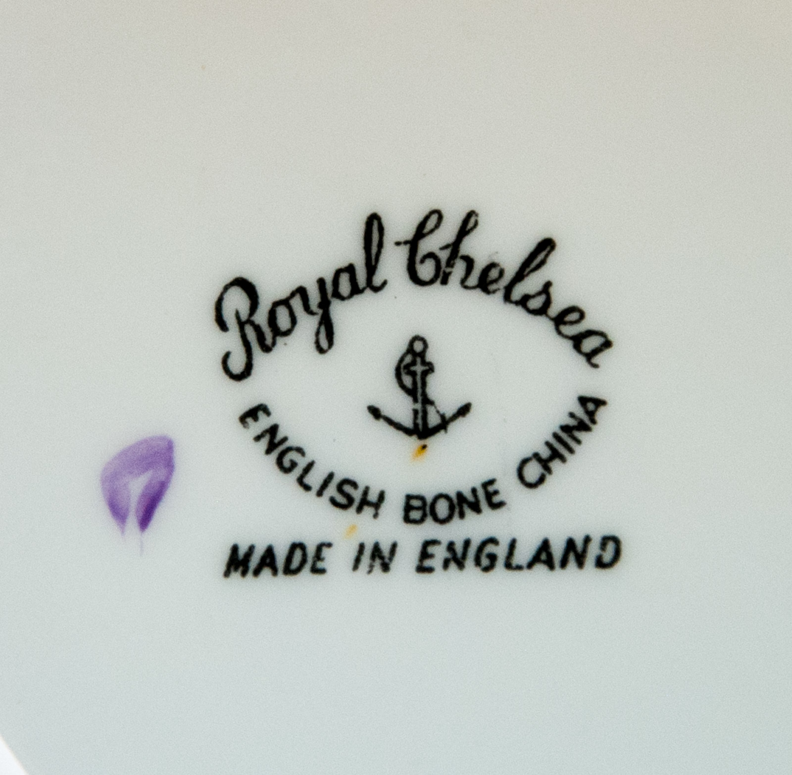 Royal Chelsea 5-5/8" bone china saucer. This china is decorated with lavender and yellow pansies with a gold band on the rim. This saucer is in excellent, pre-owned condition, with just a few light marks on the surface.
