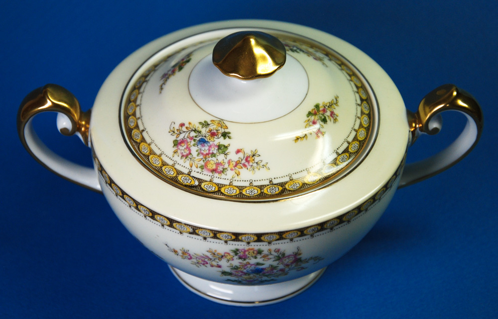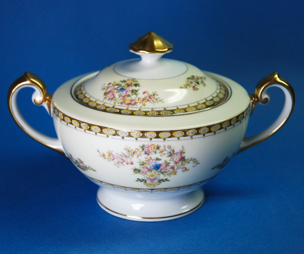 Royal Embassy Fresuno / Fresno sugar bowl with lid. There are pink, yellow and blue flowers against a cream background. The side of the sugar bowl looks white in the photographs, but it is also cream colored. Gold trim. Excellent condition. About 4-1/4" tall with the lid on. This is a discontinued pattern, Made in Japan. Please email any questions.