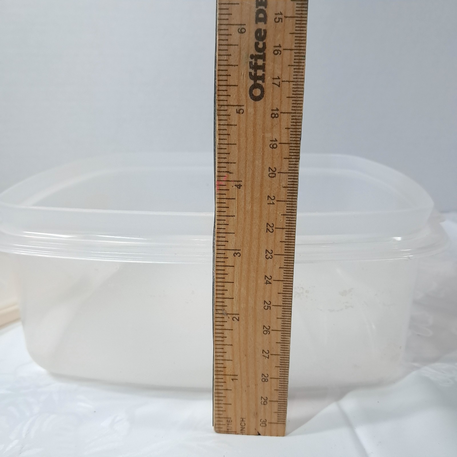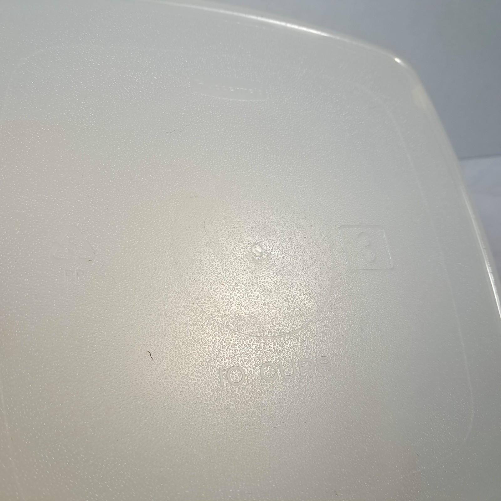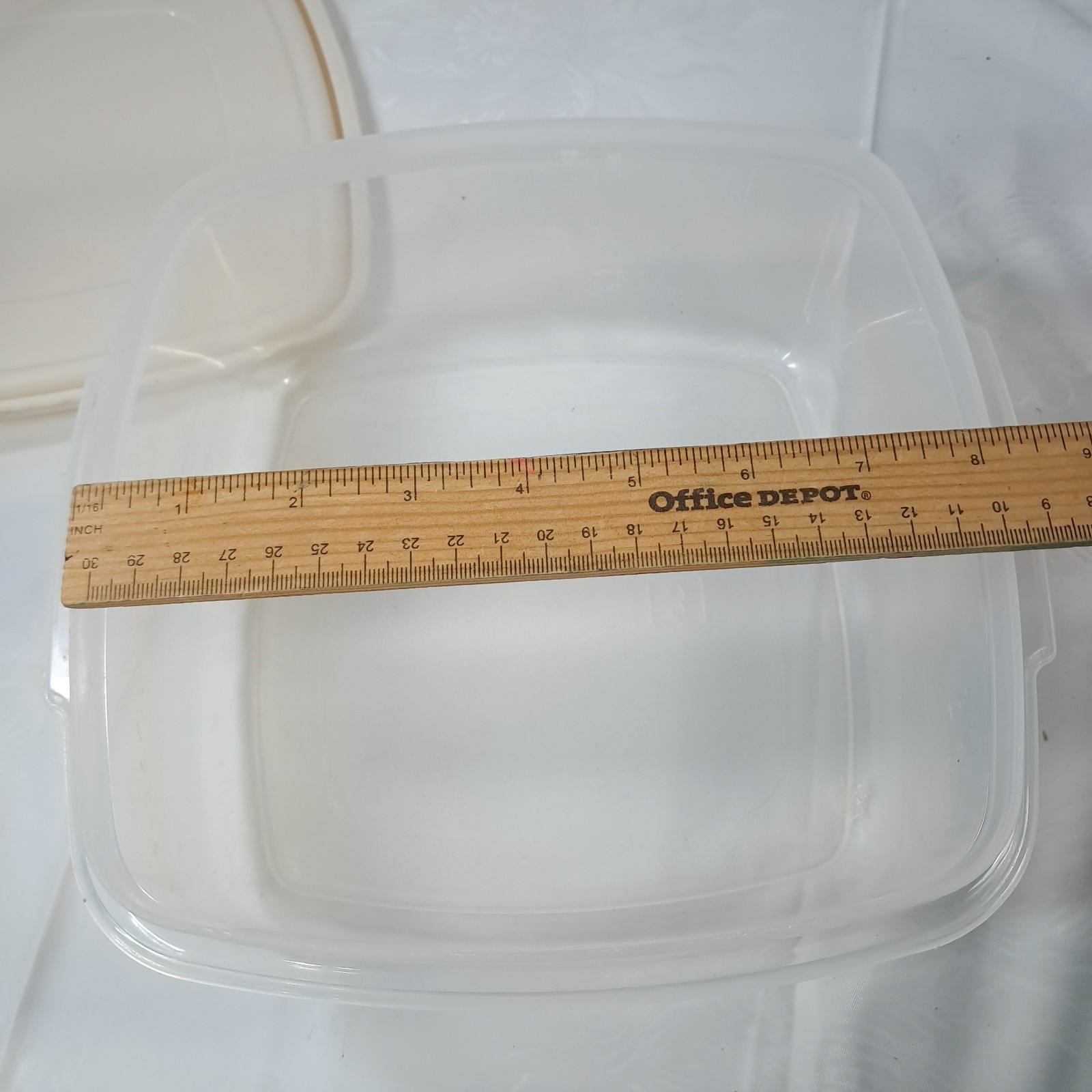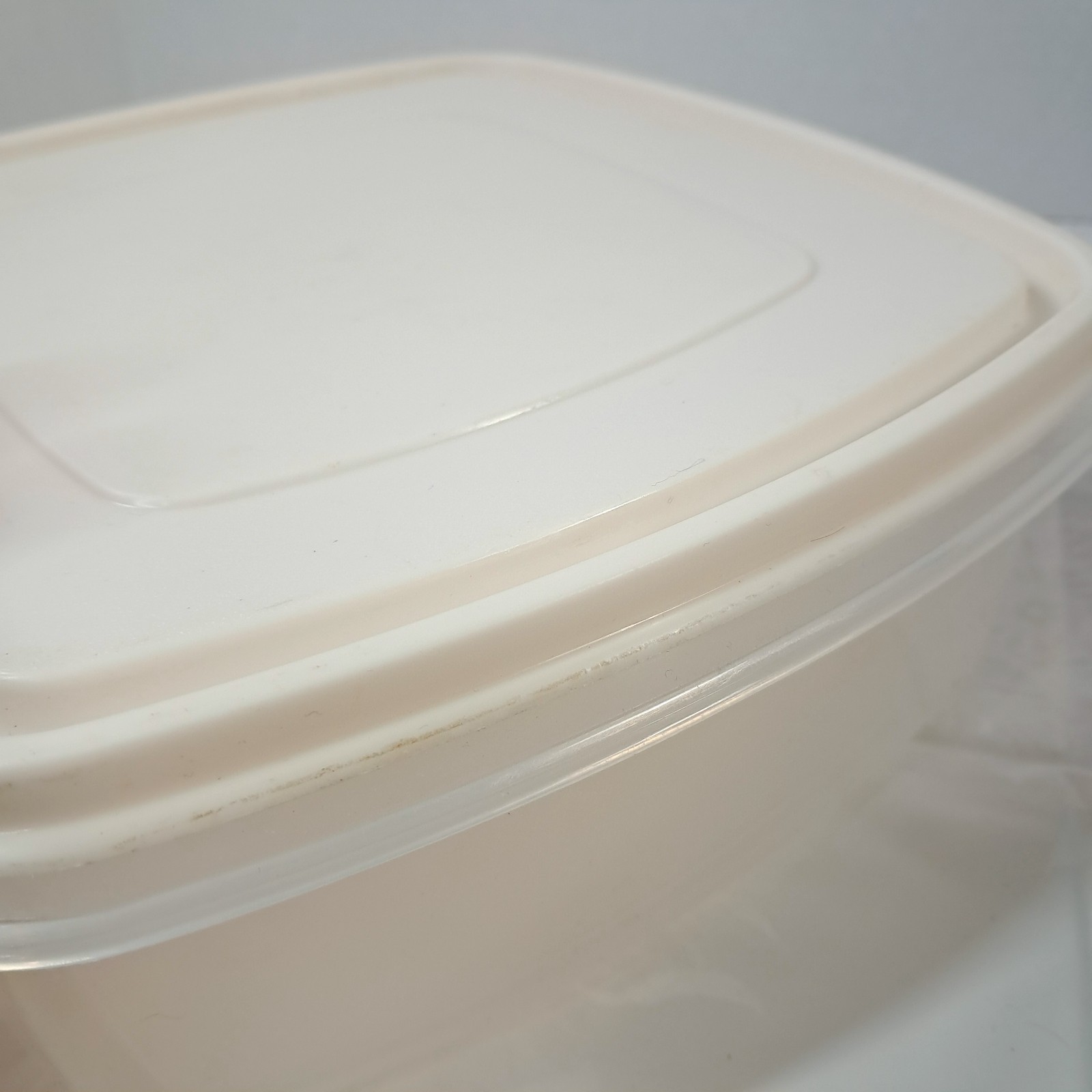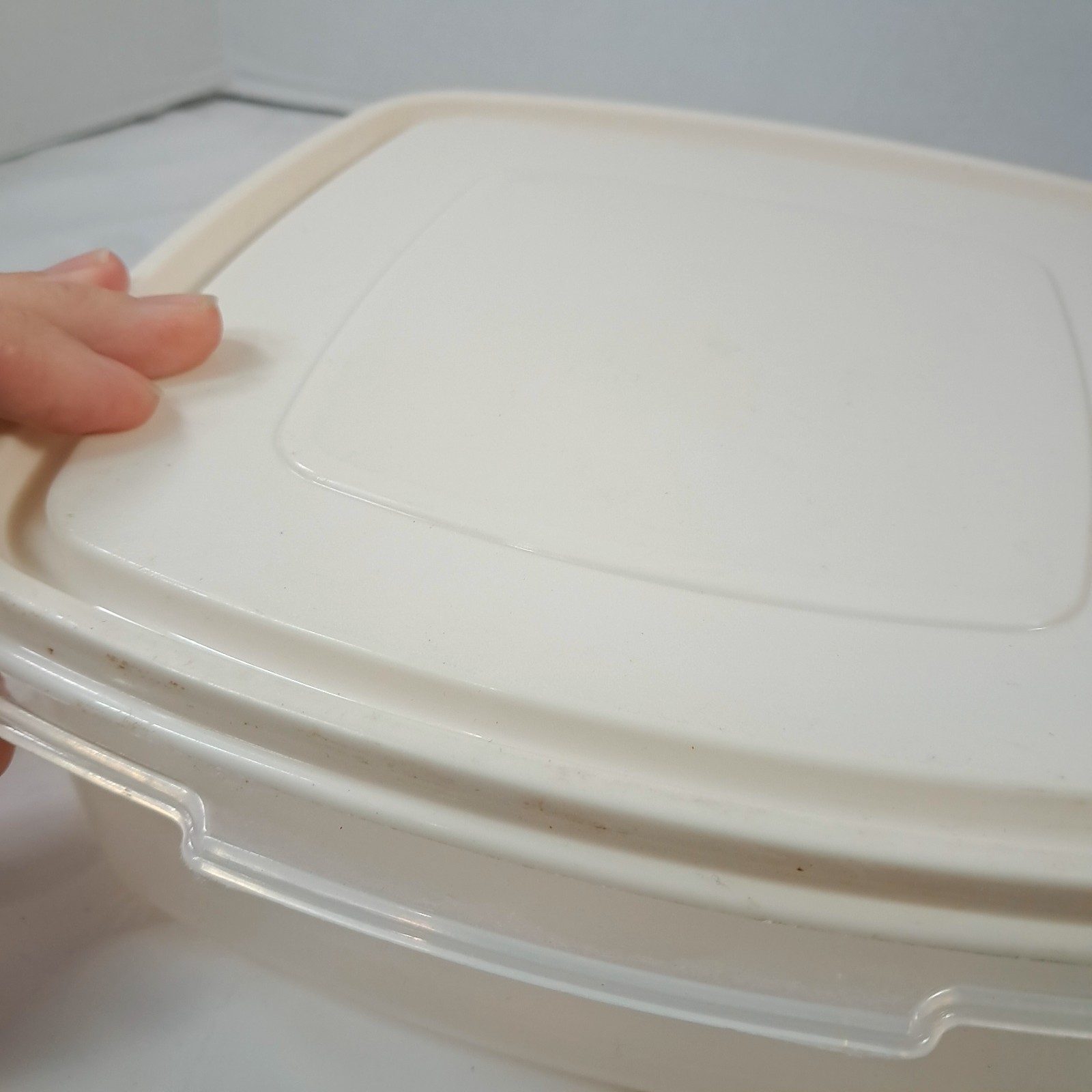 Rubbermaid Servin' Saver 10 Cup #3 Square Container Almond Lid 0014 Vintage Plastic container with off white/almond lid. Some plastic wear/marks as shown.