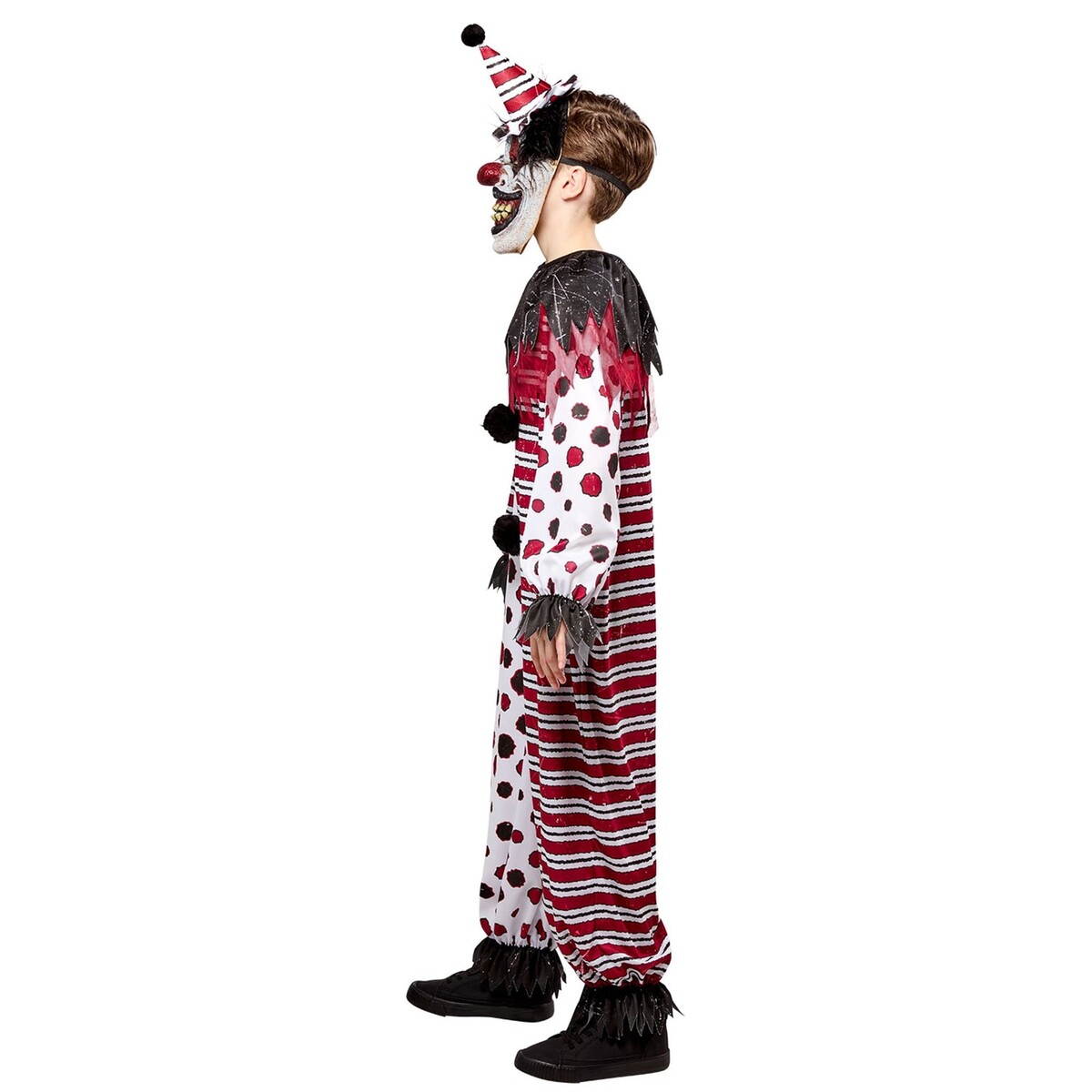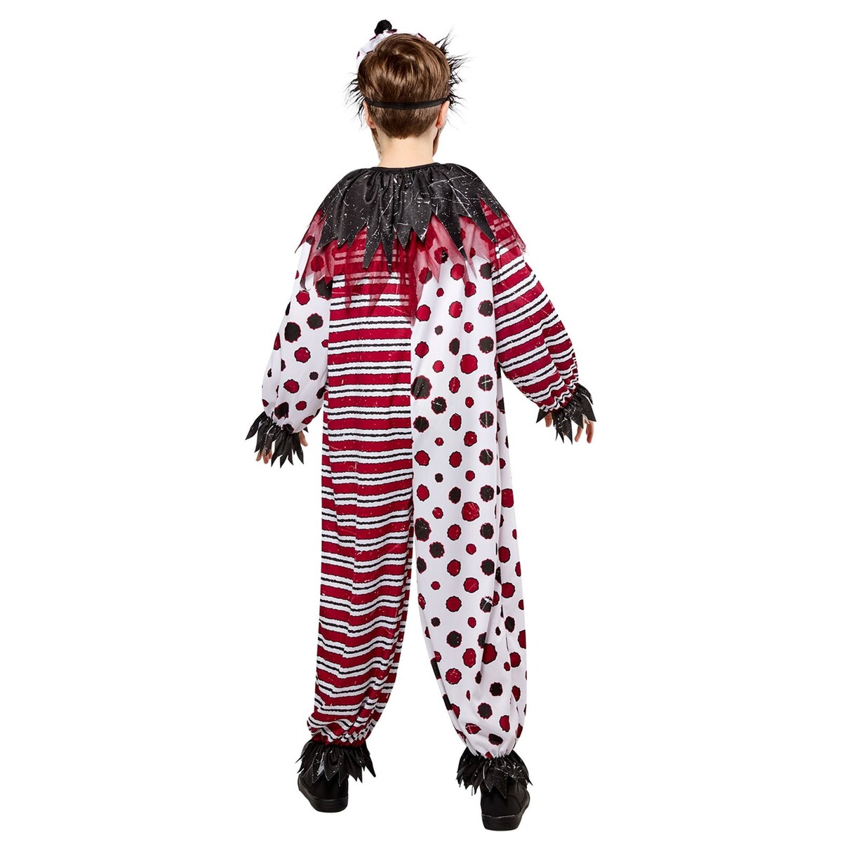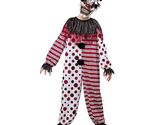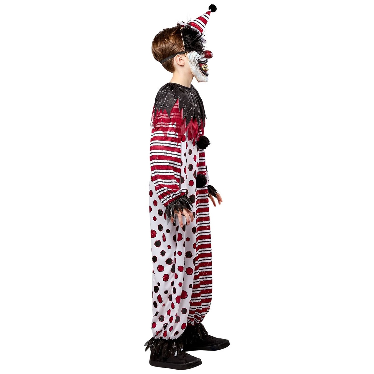 Rubies Boys Creepy Clown Costume Multicolor M (8) Costume Components: Includes a jumpsuit and a half mask, designed for a complete creepy clown transformation. Material Composition: Constructed entirely from polyester for durability and comfort. Secure Fastenings: Features a pull-on jumpsuit with a hook and loop closure at the back and an elastic band on the half mask for a secure fit. Design Aesthetics: The jumpsuit showcases a red, white, and black printed design with dual stripes, polka dots, jagged collar and cuff details, and two black pom-poms. Mask Features: The terrifying clown mask includes a sinister smile, soul-piercing eyes, a red nose, wild hair, and a matching party hat, with hidden eye holes. Occasion Versatility: Ideal for Halloween, haunted houses, themed parties, or any event where a frightfully fun costume is desired