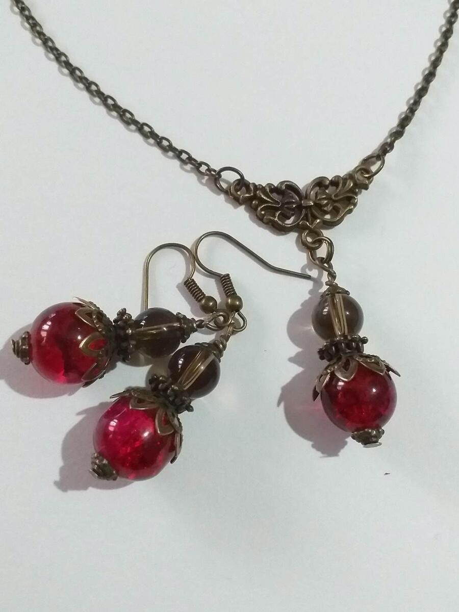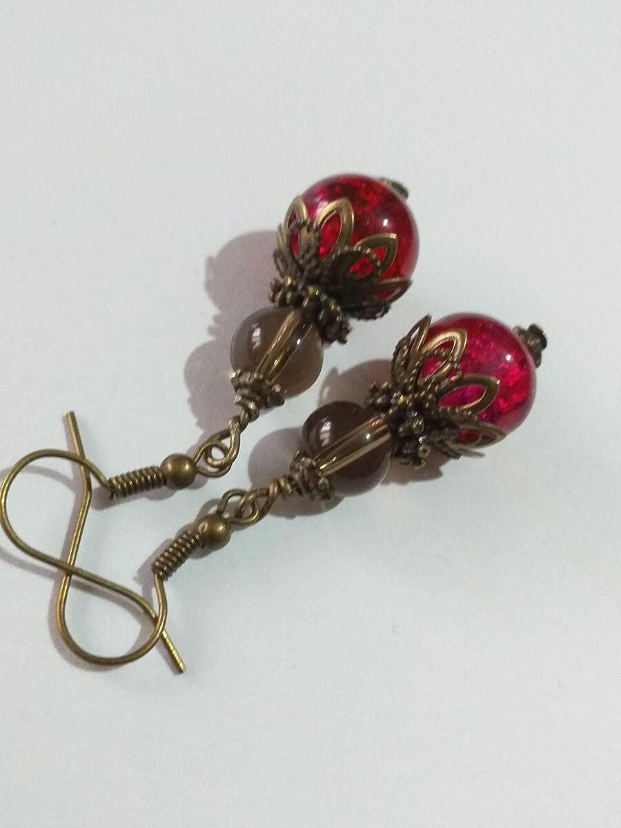 Victorian earrings ruby red crackle glass beads and Smoked quartz earrings bronze earrings Boho Earrings Bohemian earrings antique style earrings Filigree drop earring vintage style earrings gypsy style earrings