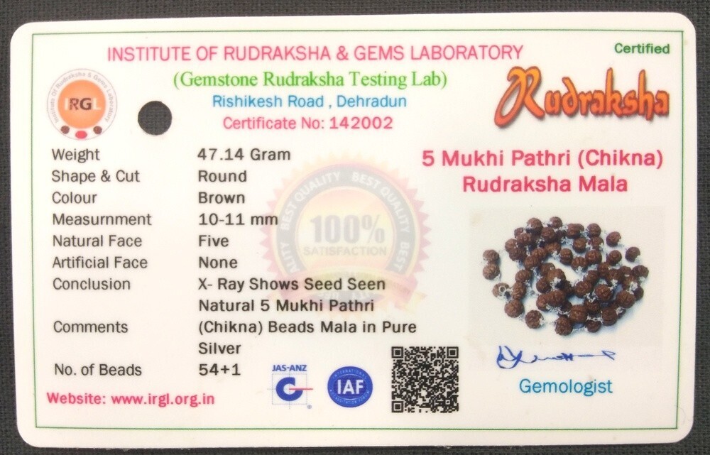 Rudraksha Chikna (Pathri) Beads Mala in Pure Silver - 11mm - 54Beads - Certified
