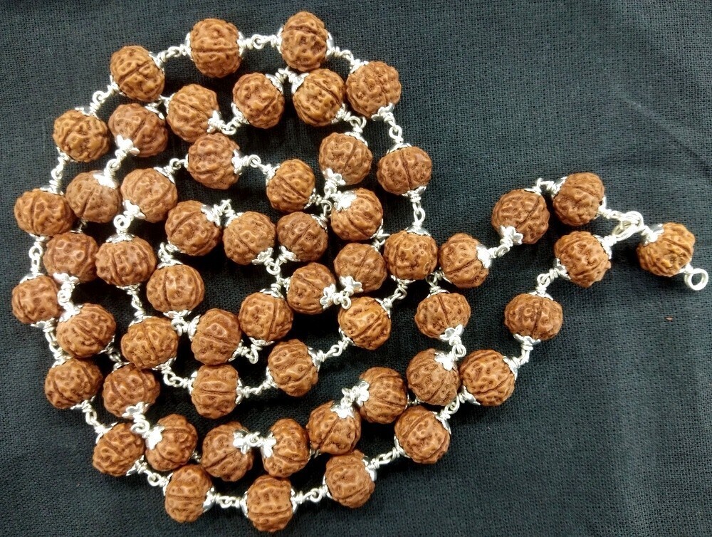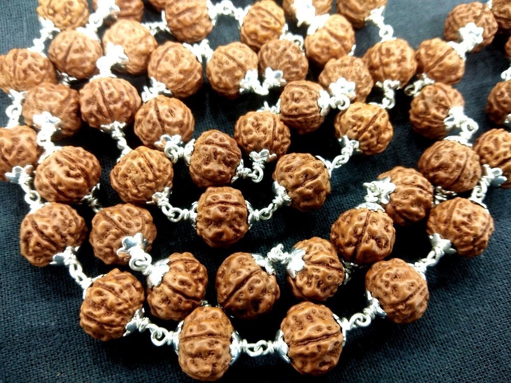 Design : Super Quality 5 Mukhi Rudraksha are design as a mala In Silver Knotted Style wire with silver caps on all beads .
