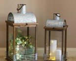 Here is a new pair of rustic lanterns, made of wood and metal and has a dome metal top on each one, they each have a metal trim around the bottoms and distressed brown wood trim around the Glass sides, have a latch on front tops so can lift up and open tops so can put candles or greens inside, very nice rustic lanterns, the large one measures 26.5 inch tall by 12 inch wide and 12 inch in diameter, IS A UNIQUE HUGE SIZE LANTERN, And the medium size one measures 23 inch tall by 9.5 inch wide and 9.5 inch in dia. Very nice pair of huge size lanterns and candles and greens not included, these would look great together in a room with your favorite candles inside or greens or could add lights inside, etc and could separate and use in different rooms, nice lanterns and i have on SALE At a great price, Almost Half Off, and check out my other lanterns i carry and decor and lighting