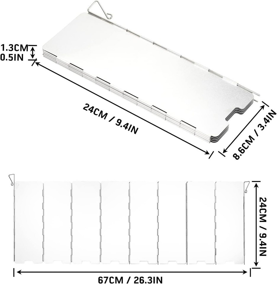 [Size]- Unfold camping stove windscreen size: 9.4 x 26.3 inch/24 x 67 cm, fold stove windscreen size: 9.44x 3.4 inch/24 x 8.6 cm. This folding stove windshield is tall and large to protect the flame from being blown around.