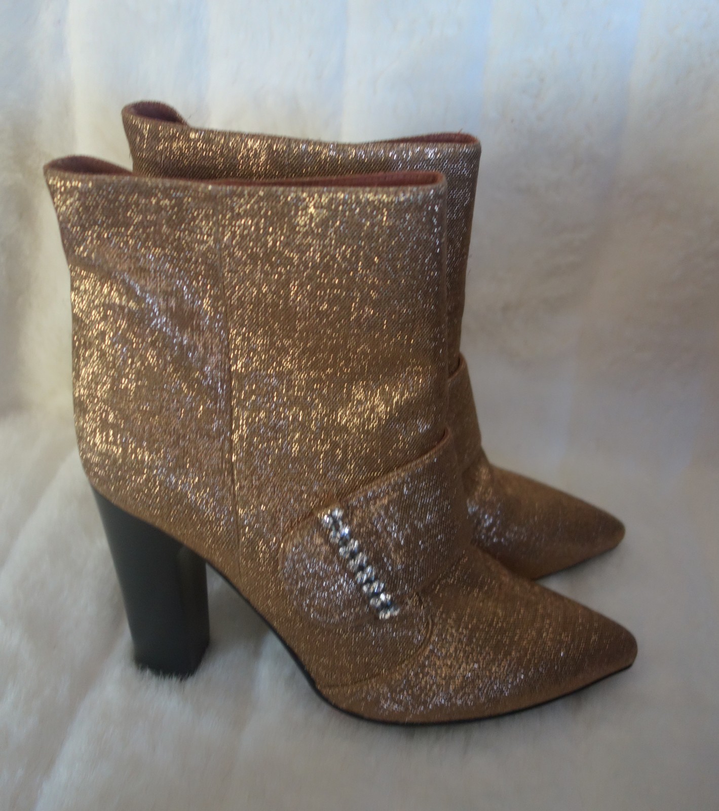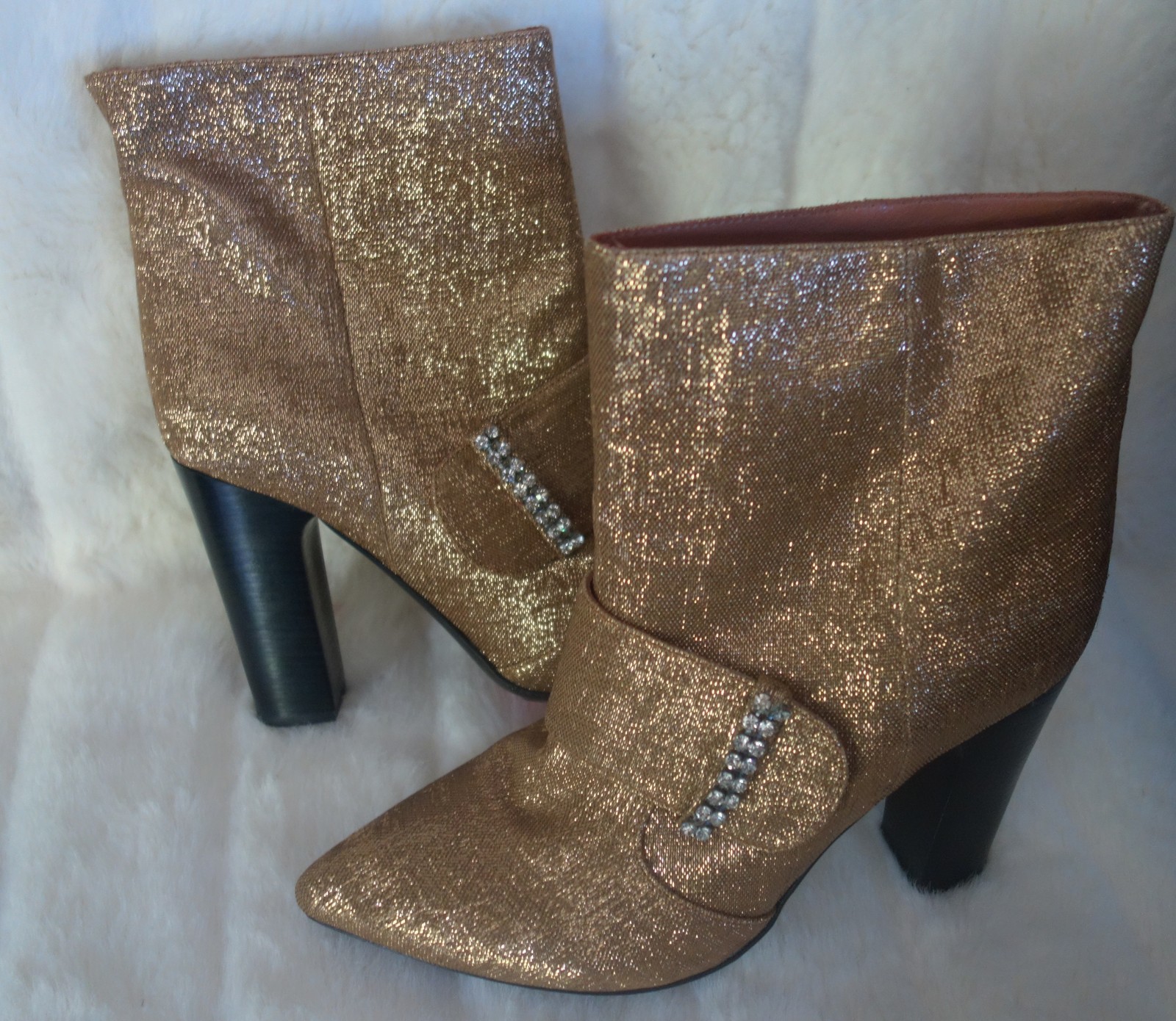 100% AUTHENTIC NEW(STORE DISPLAY ITEM SOME SCRATCHES ON THE BOTTOMS FROM STORE TAGS AS SHOWN) SEE BY CHLOE Designer Metallic Gold Pointed Toe Heel Bootie Shoes See by Chloe presents an ankle boot that is made for evenings out, yet with a boot silhouette it can also dress up your daytime looks. Metallic fabric upper. 4" stacked block heel. Pointed toe. Strap across front with crystal-embellished belt loop. Leather lining. Leather outsole. Imported ATTENTION, INTERNATIONAL BUYERS PLEASE READ: Please be aware that your country may charge customs fees and/or taxes on your item when you receive it. You will be responsible for these fees/charges.Please be aware that some countries have restrictions on importing jewelry and other items. WE cannot, ship to your country if import of a particular class of goods is prohibited. ATTENTION, INTERNATIONAL BUYERS PLEASE READ: Please be aware that your country may charge customs fees and/or taxes on your item when you receive it. You will be responsible for these fees/charges.Please be aware that some countries have restrictions on importing jewelry and other items. WE cannot, ship to your country if import of a particular class of goods is prohibited.