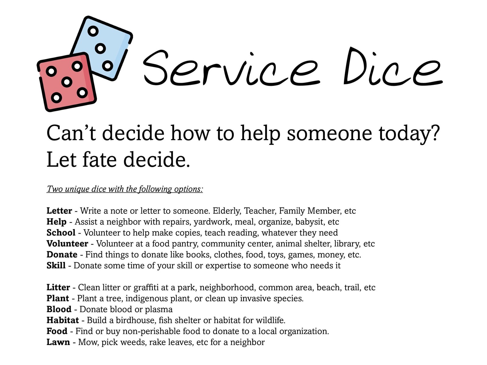 - SERVICE IDEA DICE | Leave your Good Deed up to Fate | Set of 2 Unique 1.4" Dice