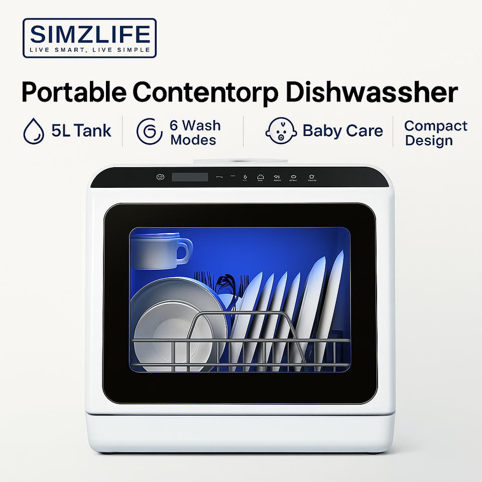 Bring convenience and cleanliness to your kitchen with the SIMZLIFE Compact Countertop Dishwasher. Designed for modern living, this portable dishwasher is ideal for small apartments, offices, dorms, and RVs ? offering six efficient wash modes and a built-in 5L water tank, so you can use it anywhere without needing a water hookup.