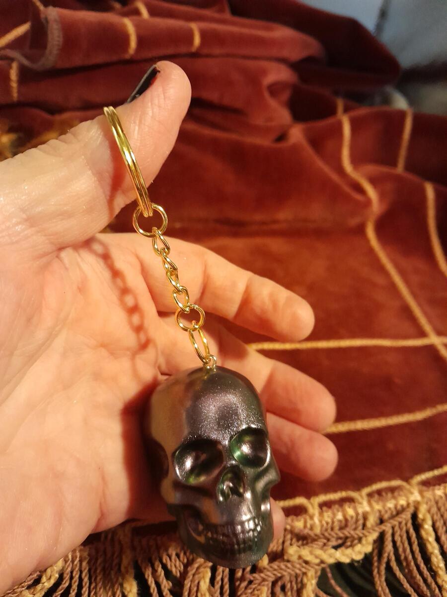 Skull keychain. Made with color change pigment powders for the coolest effect ever! Cool for bikers, vehicles, boats, anywhere you need a larger keychain that is very unique and hard to lose. Please view the photos and video.
