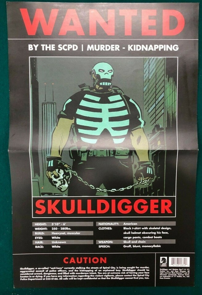 SKULLDIGGER Dark Horse Comics 11" x 17" promotional poster folded, as issued MY POSTER GRADING SYSTEM I try to be fair and honest in my grading, and make every attempt to mention significant tears, excess creasing, etc. Some minor handling wear is to be expected. FINE: a nice copy, flat with minor creases; may have some stress at folds, but no prominent defects. VERY GOOD: most of the posters I list fall into this grade. A used poster with some overall wear. GOOD: as found, complete unless noted; may have excess fold wear, etc. FAIR: rough, with many defects including tears. Small missing pieces, etc. POOR: a pretty trashed poster; almost any and every damage may be present.