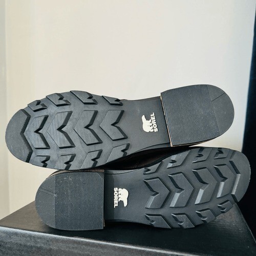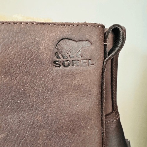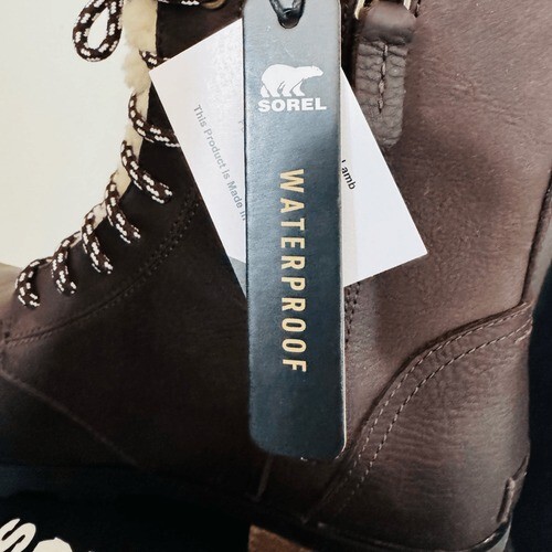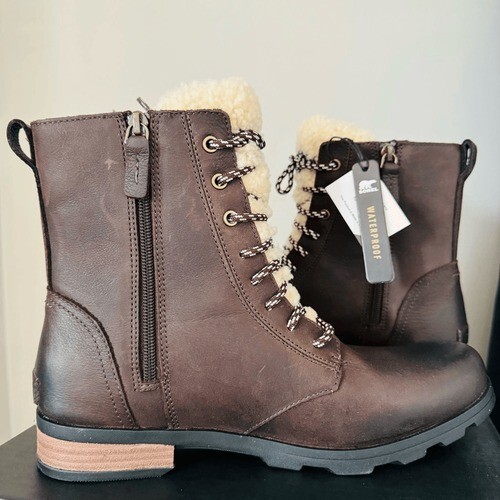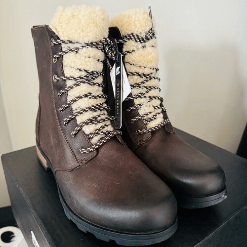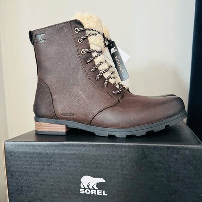 SOREL Emelie Genuine Shearling Lamb Short Lace-Up Boot Color: Blackened Brown Size: 11 NEW WITH TAGS IN ORIGINAL PACKAGING Soft genuine lamb shearling adds coziness to this lug sole boot. 6.5" shaft height Round toe Lace-up Genuine shearling lining Lug sole Leather upper/genuine shearling (origin: Australia) lining/manmade sole Imported