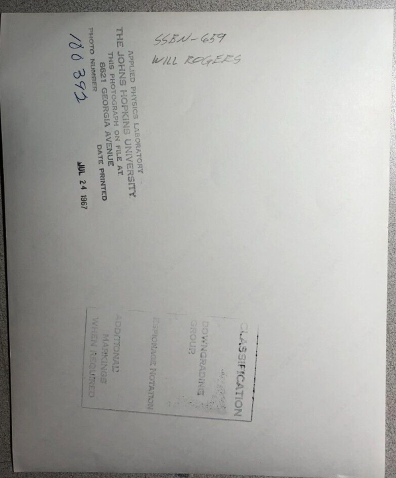 SSBN-659 WILL ROGERS submarine 8" x 10" black-and-white glossy photograph Johns Hopkins University (1967)