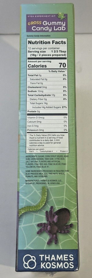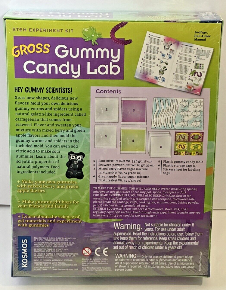 Make your own delicious gummies in gross shapes like worms and spiders! Learn about the properties of natural polymers. Mold your own gummy worms and spiders using a natural gelatin-like ingredient called carrageenan that comes from seaweed. Flavor and sweeten your mixture with mixed berry and green apple flavors and then mold the gummy worms and spiders in the included mold. You can even add citric acid to make sour gummies! A 16-page, full-color manual guides experiments and includes a wealth of scientific information. Some ingredients are processed in facilities that also process milk, egg, tree nuts, wheat, peanuts, and soybeans.
