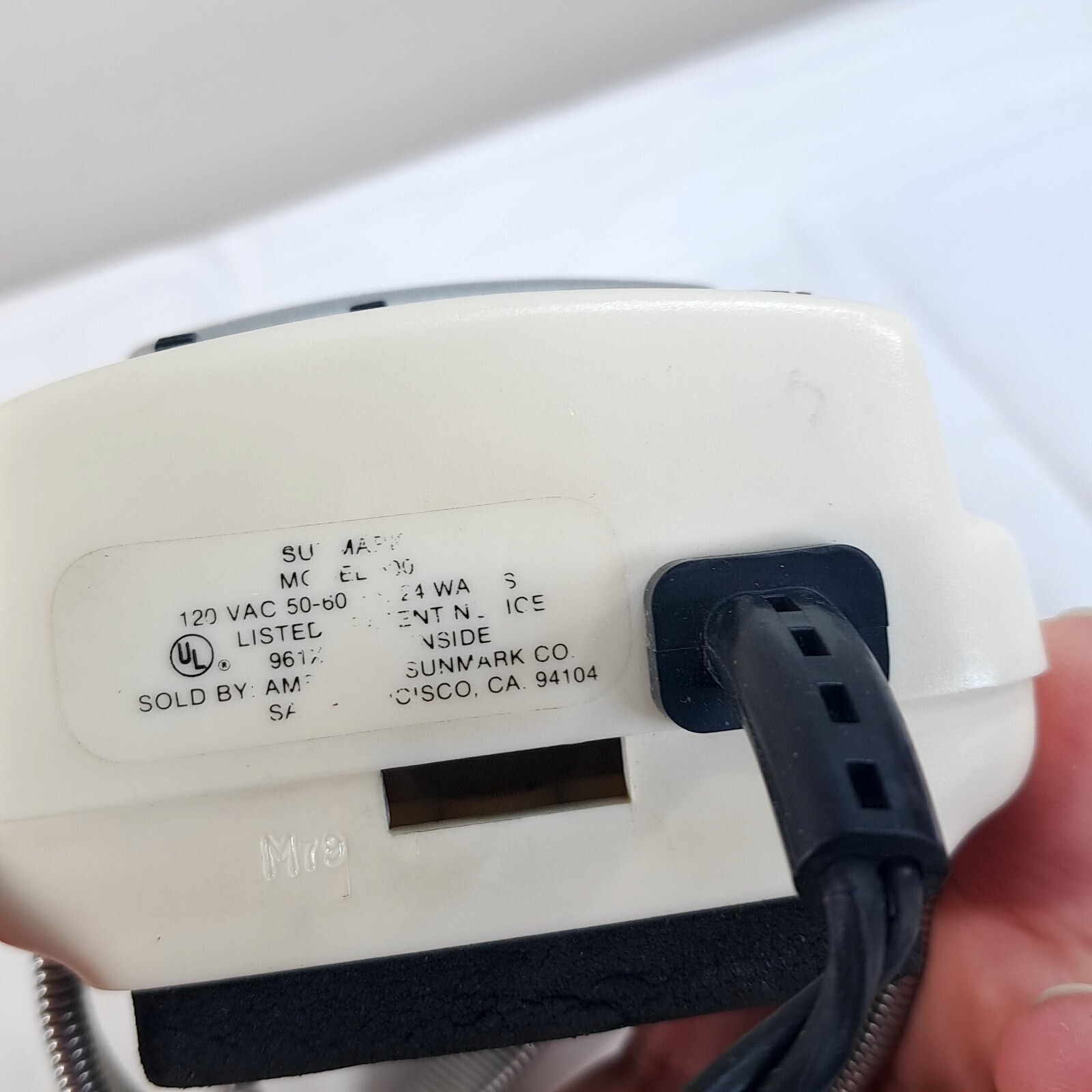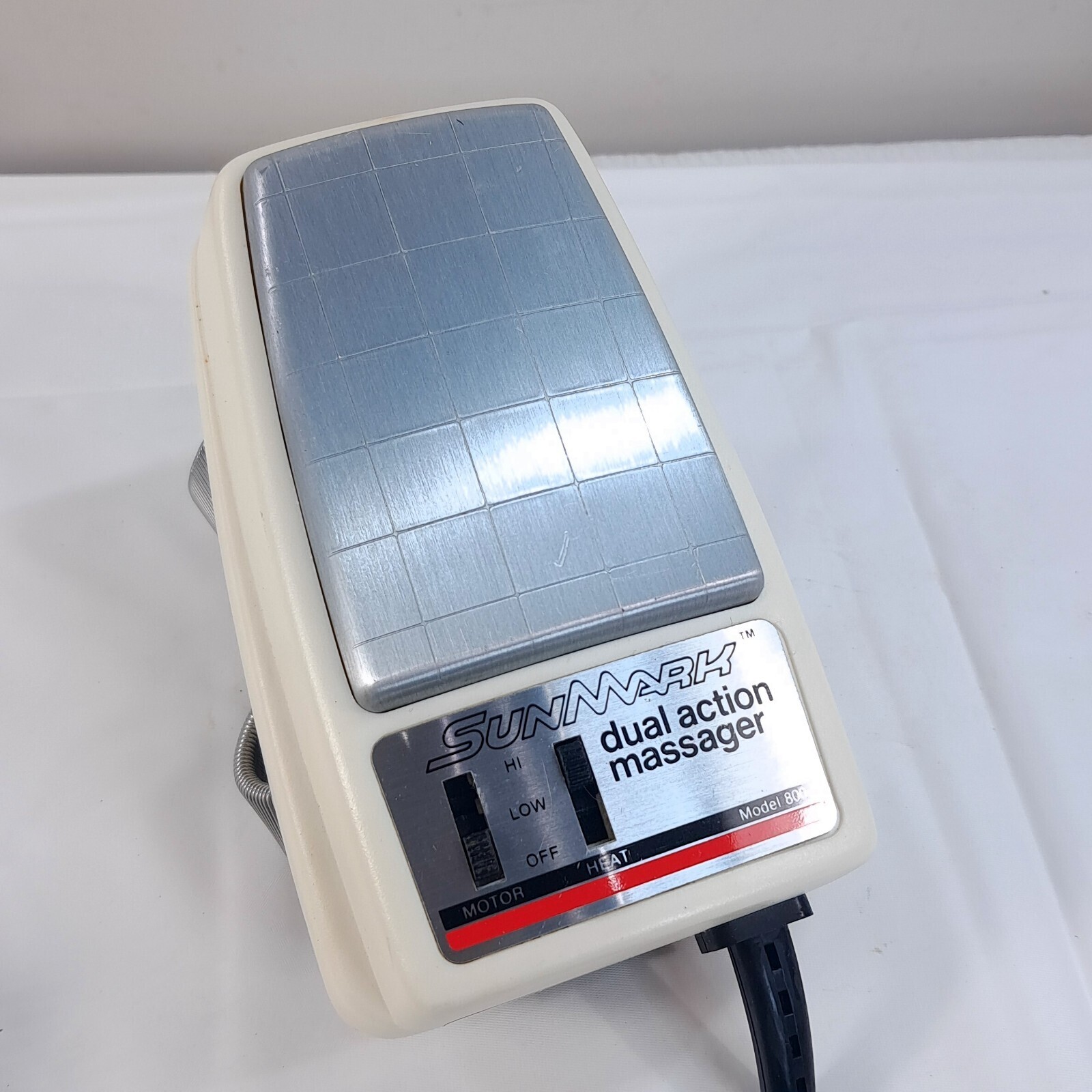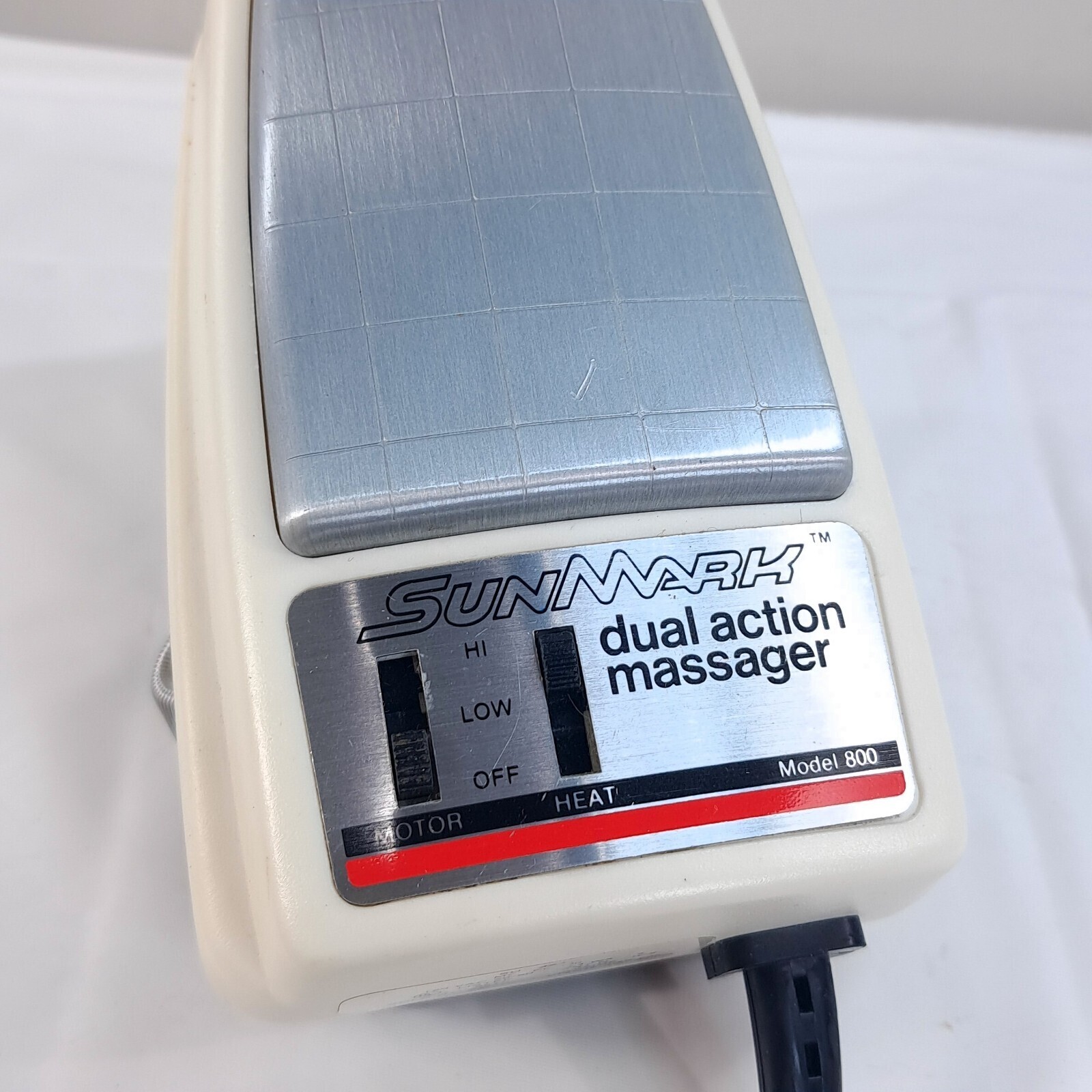 SUNMARK dual action massager Heat model 800 Sun Mark Swedish Style Handheld WORK Top band is a bit stretched out as shown and padding on the back is a little worn as shown. Works great! Vibrates and heat.