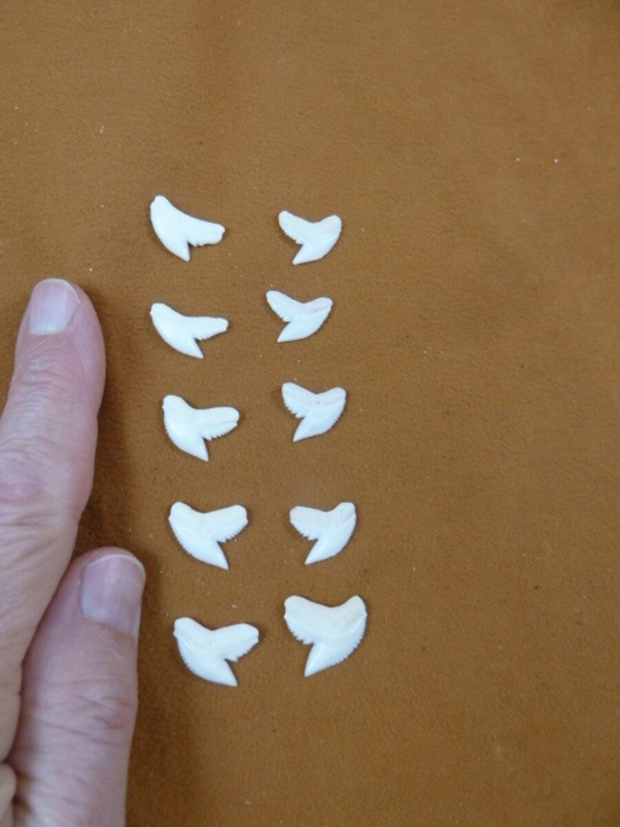 (#SW1-N-2-50) This sale is for a bag of 10 matched teeth (5 lefts and 5 rights) for making earrings, NOT WIRED loose genuine shark teeth, using modern, white, TIGER SHARK TEETH shark teeth from the legal Philippines fishing industry that uses the whole shark (meat, hide and teeth).
