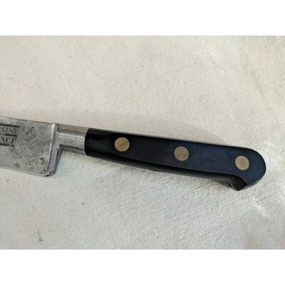Mots cles : couteau de cuisine, couteau utilitaire, couteau de chef, couteau d'office, couteau a trancher, manche noir, lame en acier, preparation des aliments, outil de cuisine, cuisine domestique, dortoir, cuisine en plein air, cuisine vintage, culinaire